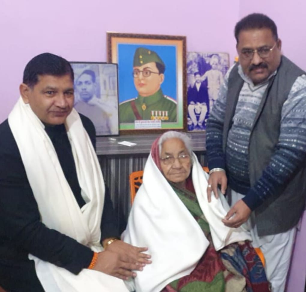 कुरुक्षेत्र। गणतंत्र दिवस की पूर्व संध्या पर हरियाणा सरस्वती हेरिटेज बोर्ड राज्य सरकार के वाइस चेयरमैन धुम्मन सिंह किरमिच और भाजपा की ओर से स्वतंत्रता सेनानी स्व. अमरनाथ शर्मा की वीरांगना सीता देवी को उनके घर आकर सम्मानित किया। इस मौके पर भाजपा के मंडल अध्यक्ष हरीश अरोड़ा ने भी सीता देवी को शॉल ओढ़ाई और नेताजी सुभाष चंद्र बोस उनके सहयोगी स्वतंत्रता सेनानी पंडित अमरनाथ शर्मा को नमन किया। धुम्मन सिंह किरमिच ने इस मौके पर कहा कि भारत के यशस्वी प्रधानमंत्री नरेंद्र मोदी के नेतृत्व में भारत सरकार और राज्य सरकारों द्वारा देशभर में आजादी के 75 वें अमृत महोत्सव और नेताजी सुभाष चंद्र बोस जी की 125 वीं जयंती समारोह के साथ गणतंत्र दिवस के उपलक्ष में विभिन्न कार्यक्रम आयोजित किये जा रहे हैं। वहीं हरियाणा के मुख्यमंत्री मनोहर लाल एवं भाजपा प्रदेशाध्यक्ष ओम प्रकाश धनखड़ के प्रयासों से इन कार्यक्रमों की श्रृंखला में शहीदों, स्वतंत्रता सेनानियों और उनकी वीरांगनाओं के सम्मान कार्यक्रम और उन्हें घर घर जाकर सम्मानित किया जा रहा है।