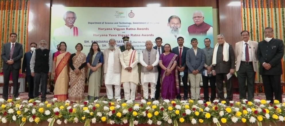 हरियाणा के उत्कृष्ट वैज्ञानिक प्रो. नीरज जैन तथा प्रो. मुकेश जैन को 2019 के लिए , प्रो. मोती लाल मदान व डॉ. सुशीला मान को वर्ष 2020 के लिए तथा डॉ. चेतन प्रकाश कौशिक व डॉ. इलोरा सेन को वर्ष 2021 के लिए हरियाणा विज्ञान रत्न पुरस्कार से सम्मानित किया गया। पुरस्कार के रूप में 4 लाख रुपये की नकद राशि प्रशस्ति पत्र, ट्रॉफी व शॉल भेंट कर सम्मानित किया।  डॉ. पूजा देवी व डॉ. राम जिवारी को वर्ष 2019 के लिए, डॉ. पवन कुमार व सतीश खुराना को वर्ष 2020 के लिए तथा डॉ. कल्पना नागपाल को वर्ष 2021 के लिए हरियाणा युवा विज्ञान रत्न पुरस्कार से सम्मानित किया गया । उन्हें पुरस्कार के रूप में एक लाख रुपये की नकद राशि प्रशस्ति पत्र, ट्रॉफी व शॉल भेंट कर सम्मानित किया गया। इस अवसर पर हरियाणा के मुख्य सचिव, संजीव कौशल, अतिरिक्त मुख्य सचिव, डा. अशोक खेमका, ए.के. सिंह, मुख्यमंत्री के अतिरिक्त प्रधान सचिव एवं सूचना जनसम्पर्क के महानिदेशक अमित कुमार अग्रवाल, सचिव राज्यपाल अतुल द्विवेदी, निदेशक विज्ञान एवं प्रौद्योगिकी चन्द्र शेखर खरे व अन्य वरिष्ठ अधिकारी उपस्थित थे।