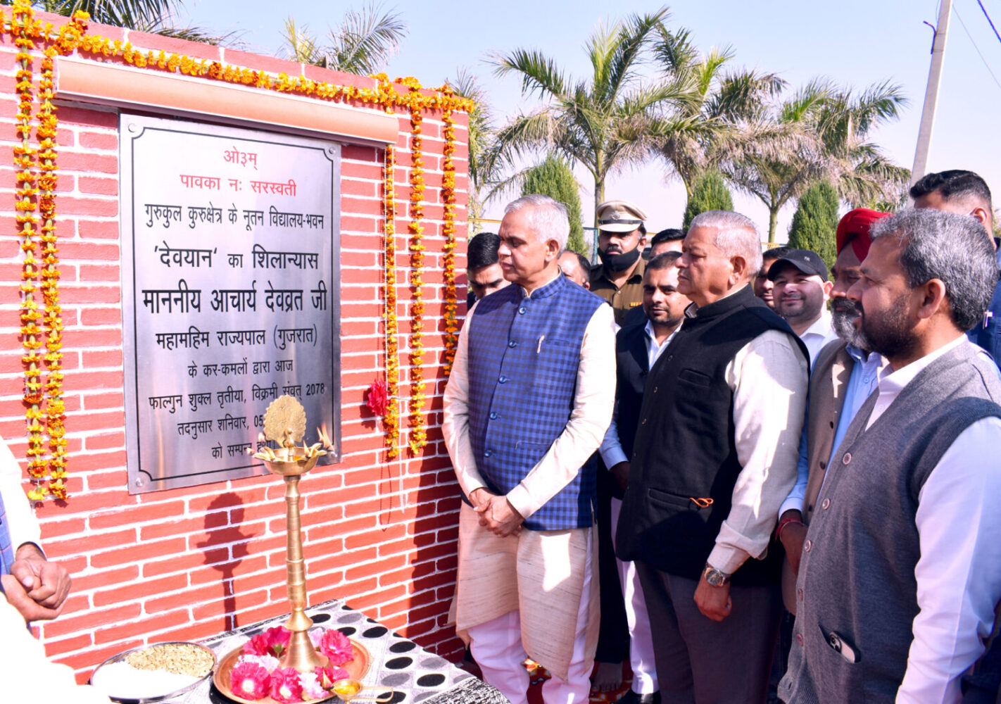 कुरुक्षेत्र। गुरुकुल कुरुक्षेत्र के नये विद्यालय भवन का आज गुजरात के राज्यपाल आचार्य देवव्रत ने शिलान्यास किया। ‘देवयान’ नाम से बनने वाली इस भव्य भवन के शिलान्यास समारोह का शुभारम्भ अग्निहोत्र से हुआ, जिसमें गुरुकुल के संरक्षक आचार्य देवव्रत मुख्य यजमान रहे। उनके साथ गुरुकुल के प्रधान कुलवन्त सिंह सैनी, तथा ओएसडी टू गर्वनर डॉ. राजेन्द्र विद्यालंकार ने वेद-मंत्रों की पावन ध्वनि के मध्य यज्ञ में घी-सामग्री की आहूतियां प्रदान की। आर्ष महाविद्यालय गुरुकुल कुरुक्षेत्र के आचार्य सत्यप्रकाश के ब्रह्मत्व में यज्ञ सम्पन्न हुआ जिसमें आर्य प्रतिनिधि सभा हरियाणा के उपमंत्री राधाकृष्ण आर्य, गुरुकुल के सह प्राचार्य शमशेर सिंह, मुख्य संरक्षक संजीव आर्य सहित समस्त अध्यापक व संरक्षकगण उपस्थित रहे। शिलान्यास के उपरान्त आचार्य देवव्रत ने सभी अध्यापकों को नये विद्यालय भवन के लिए बधाई व शुभकामनाएं दीं।