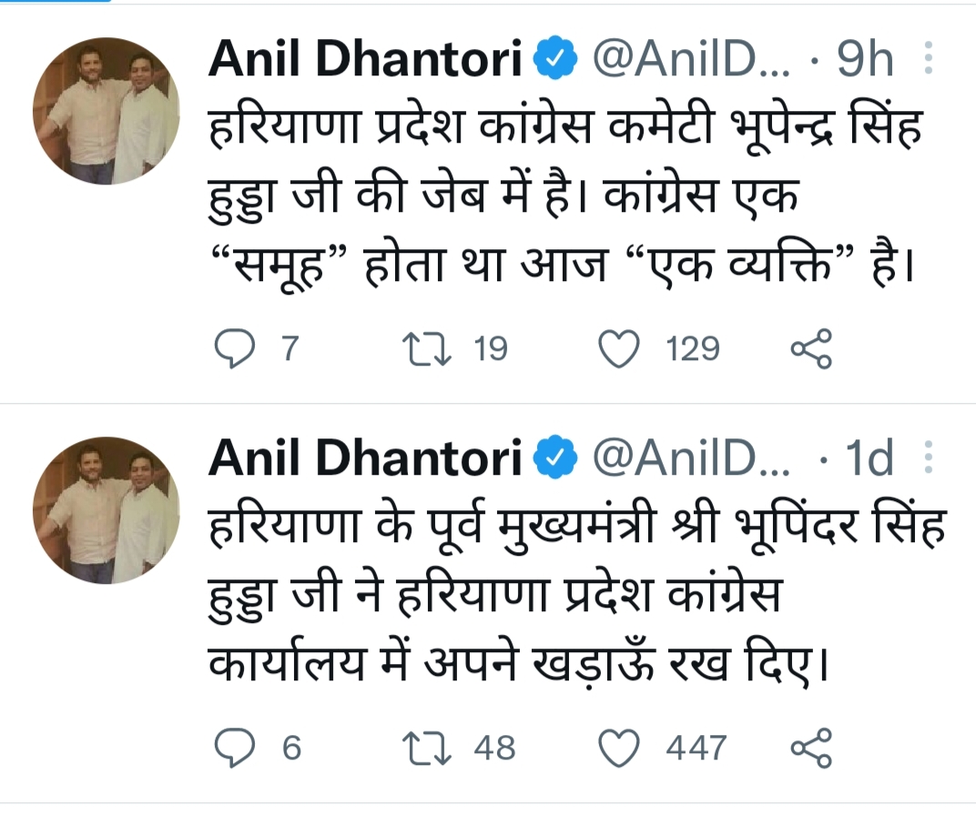 प्रतीत हो रहा है कि इस तरह की चाहत और दावे करने वालों को संभवतःअंदरुनी उफान का अंदाजा नहीं होगा। इस उफान की दो लहरें दो दिन के भीतर एक कांग्रेसी नेता के ट्वीट में दिखाई दे रही है। यह ट्वीट किया है राहुल गांधी की युवा ब्रिगेड के पूर्व विधायक अनिल धंतौड़ी ने। अनिल धंतौड़ी कुरुक्षेत्र जिला की शाहाबाद विधानसभा सीट से विधायक रह चुके हैं। उन्होंने अपनी राजनीति कांग्रेस के छात्र विंग एनएसयूआई से शुरु की थी। अनिल धंतौड़ी ने अपने ट्वीट में लिखा है कि हरियाणा के पूर्व मुख्यमंत्री श्री भूपेंद्र सिंह हुड्डा जी ने हरियाणा प्रदेश कांग्रेस कार्यालय में अपनी खडाऊं रख दिए। इसके कुछ घंटों बाद अनिल धंतौड़ी ने अपने अगले ट्वीट में लिखा है कि हरियाणा प्रदेश कांग्रेस कमेटी भूपेंद्र सिंह हुड्डा जी की जेब में है,कांग्रेस एक समूह होता था,आज एक व्यक्ति है।जिक्रयोग है कि एक दिन पहले कुरुक्षेत्र जिला की थानेसर विधानसभा सीट से विधायक रह चुके और भूपेंद्र सिंह हुड्डा के करीबी कहे जाने वाले पूर्व विधायक रमेश गुप्ता आम आदमी पार्टी में जा चुके हैं।