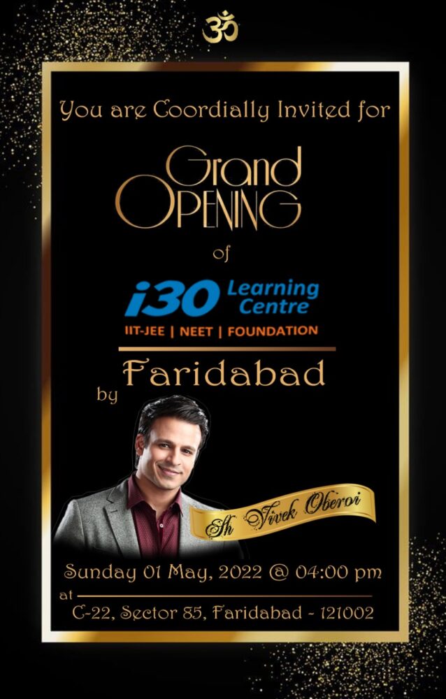 फरीदाबाद। फरीदाबाद के सेक्टर 85 में रविवार दिनांक 1/5/22 को आइ-30 लर्निंग सेंटर की ग्रैंड ओपनिंग होने जा रही है इस सेंटर का शुभारंभ प्रसिद्ध बॉलीवुड अभिनेता विवेक ओबेरॉय करेंगे।ये इस संस्था की शाखाएं पूरे में फैली हुई हैं फरीदाबाद में इसका ये 100 सेंटर होगा।इस अवसर पर फरीदाबाद की गणमान्य हस्तियां विधायक सीमा त्रिखा, विधायक राजेश नागर,आदि गणमान्य लोग उपस्थित रहेंगे।इस समारोह के आयोजक गोल्डी खुराना ने बताया कि इस सेंटर में यूपीएससी, आइआइटी जे ईई,नीट,और आठवीं कक्षा से बारहवीं कक्षा तक की आन लाईन और आफ लाईन पढ़ाई कराई जायेगी।ये समारोह एक मई को शाम 4 बजे से 6 बजे तक होगा।इस अवसर पर आये हुए मुख्य अतिथि विवेक ओबेरॉय एवं दूसरे गणमान्य अतिथि ऐक प्रैस वार्ता को भी संबोधित करेंगे।