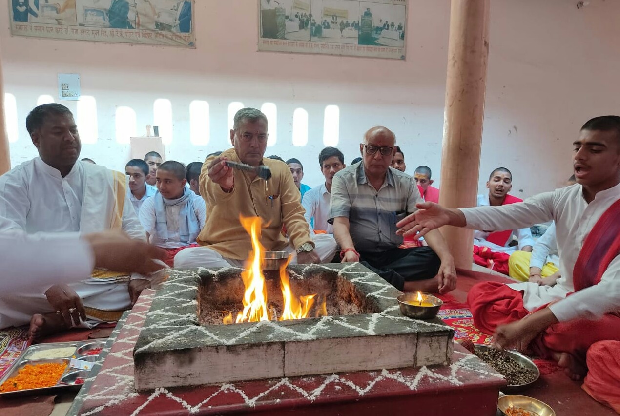 सभा की ओर से गीता मनीषी की दीर्घायु हेतु किया गया यज्ञ, साधु संतों में बांटे फल, गायों को खिलाया हरा चारा