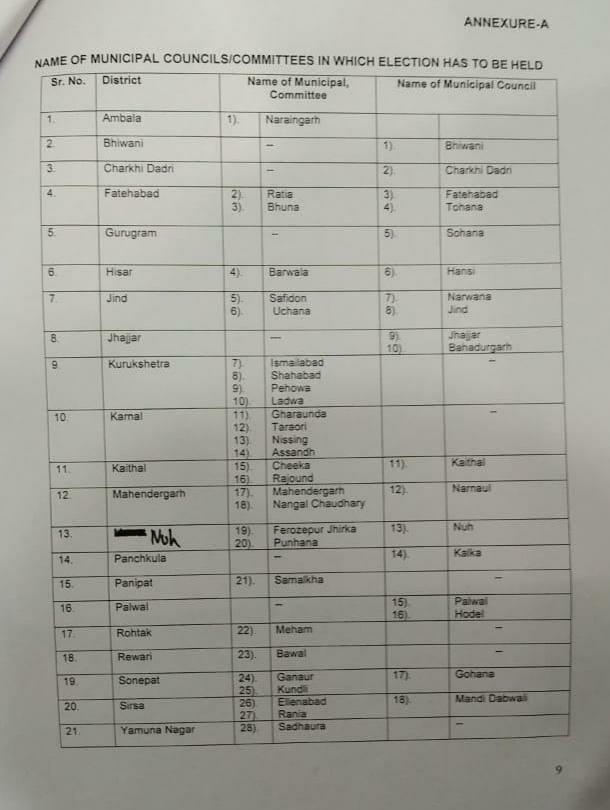 अंबाला और थानेसर नगर परिषद को छोड़ कर गोहाना,होडल, पलवल, सोहाना, मंडी डबवाली, चरखी दादरी, झज्जर, जींद, कैथल, हांसी, बहादुरगढ़, नरवाना, टोहाना, नूंह, कालका, नारनौंद, फतेहबाद, भिवानी, तरावड़ी, निसिंग, चीका, महम, राजौंद, पिहोवा,ईस्माईलाबाद,शाहाबाद, लाडवा, उचाना, महेंदगढ़, घरौंडा, सफीदों, गन्नौर, भूना, बावल, ऐलनाबाद, नांगल चौधरी, नारायणगढ़, रतिया, बरवाला, समालाखा, फिरोजपुर झिरका, पुन्हाना, असंध, रानियां, सढौरा, कुंडली में परिषदों और पालिकाओं के चुनाव होंगे।