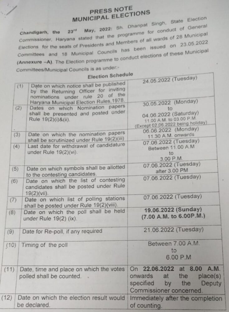 चंडीगढ़। राज्य चुनाव आयोग के आयुक्त धनपत सिंह ने आज पत्रकारवार्ता कर 18 नगर परिषदों और 28 नगर पालिकाओं के चुनावों शैड्यूल जारी कर बिगुल बजा दिया है। उन्होंने बताया कि 24 मई को चुनाव का नोटिस जारी होगा। इसके बाद 30 मई से 4 जून तक नामांकन कि प्रक्रिया चलेगी। 6 जून को स्क्रूटनी होगी और 7 जून को नाम वापिस लिए जा सकेंगे और उसी दिन इलेक्शन सिंबल दिए जाएंगे,जबकि उसी दिन उम्मीदवारो की सूची जारी की जाएगी। 7 जून को ही पॉलिंग स्टेशन की लिस्ट जारी की जाएगी। 19 जून को होगा मतदान 7 बजे से शाम 6 बजे तक होगा। अगर आवश्यकता हुई तो 21 जून को रिपोल होगा और 22 जून को मतगणना होगी।
