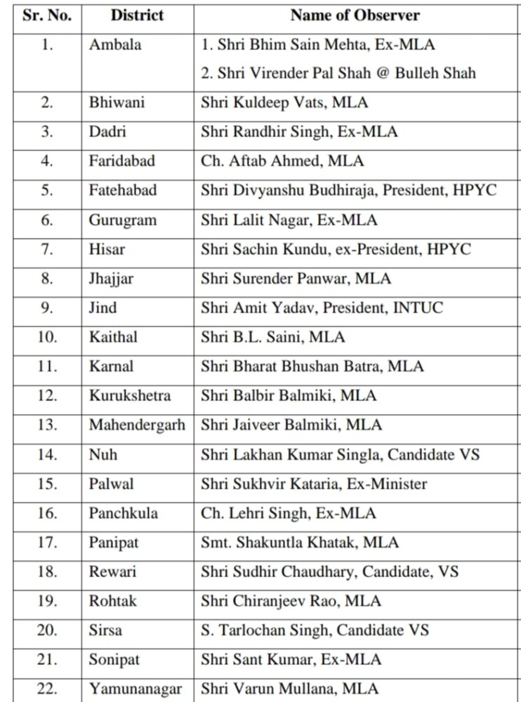 चंडीगढ़। हरियाणा नगर परिषद और नगर पालिकाओं के चुनाव के लिए हरियाणा प्रदेश कांग्रेस कमेटी ने सभी जिलों में पर्यवेक्षक नियुक्त कर दिये हैं। एक दिन पहले प्रदेश निर्वाचन आयोग द्वारा जारी किए गए शैड्यूल के बाद मुख्य राजनीतिक दलों ने पुख्ता रणनीति बनाकर मैदान में उतरने का इरादा बनाया है और अधिक से अधिक सदस्य और चेयरमैन पद पर जीत दर्ज हो,इसकी तैयारी भाजपा,जजपा,कांग्रेस,इनेलो और आम आदमी पार्टी जी जान से कर रही है। कांग्रेस ने आज जिन 22 जिलों में पर्यवेक्षेकों के नाम घोषित किए हैं। इनमें अधिकांश विधायक,पूर्व मंत्री,विधायक और संगठन के नेताओं के तवज्जों दी है।