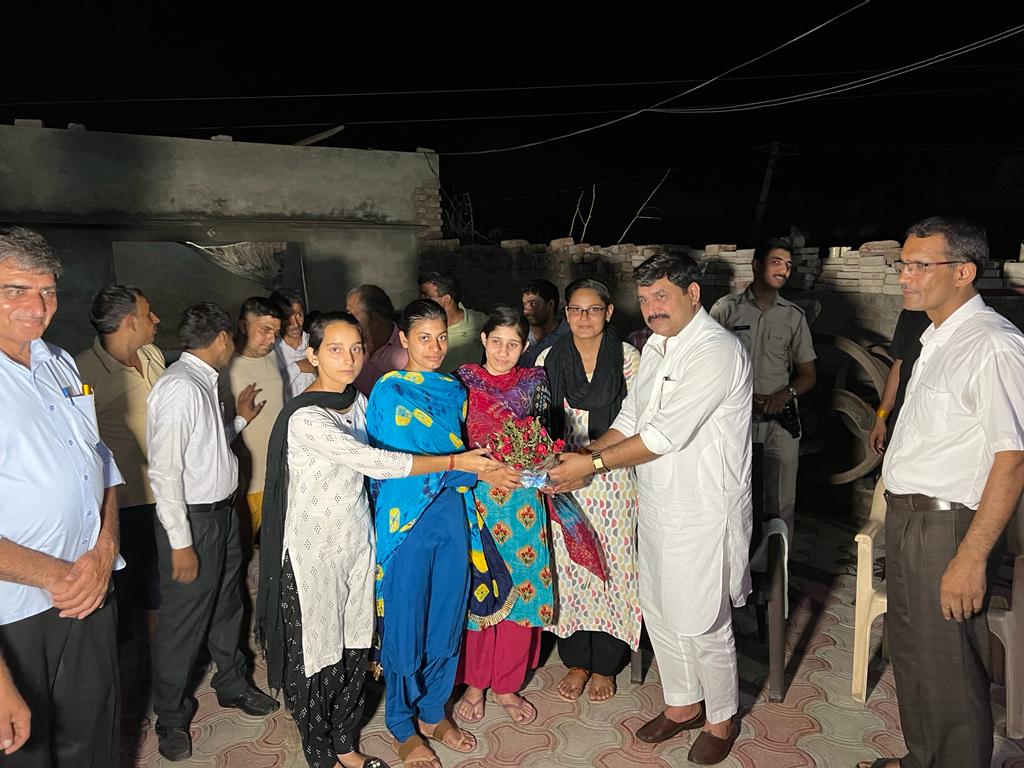 महम।12वीं की परीक्षा में बेहतरीन प्रदर्शन कर महम चौबीसी का नाम पूरे प्रदेश में रोशन करने वाली निंदाना गांव की बेटी काजल नेहरा समेत तीसरे एवं सातवें तथा आठवें नम्बर पर आई निंदाना की बेटियों पर विधायक बलराज कुंडू ने ईनामों की बारिश कर दी है। शाम को परीक्षा परिणाम घोषित होने के बाद बेटियों की कामयाबी की खबर मिलते ही विधायक बलराज कुंडू निंदाना गांव पहुंचे। कुंडू ने 500 में से 498 अंक हासिल कर हरियाणा टॉप करने वाली काजल पुत्री रावत नेहरा तथा हरियाणा में थर्ड पोजिशन हासिल करने वाली नेहा पुत्री अजमेर, सातवें नम्बर पर आई अंशु पुत्री कृष्ण व प्रदेश भर में आठवें नम्बर पर रही दीक्षा पुत्री संजय से मुलाकात की और उनको उज्ज्ववल भविष्य की शुभकामनाएं देते हुए बेटियों को आशीर्वाद दिया।