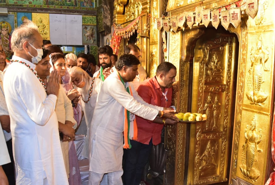 जयपुर। मुख्यमंत्री अशोक गहलोत ने शनिवार को चूरू जिला स्थित सालासर बालाजी मंदिर में दर्शन कर पूजा-अर्चना की और देश-प्रदेश की खुशहाली व अमन चैन के लिए कामना की। मुख्यमंत्री गहलोत ने शनिवार दोपहर सालासर पहुंचकर बालाजी मंदिर में धोक लगाई। मंदिर के पुजारी हेमन्त ने विधि-विधान एवं मंत्रोच्चार के साथ पूजा अर्चना करवाई। मंदिर में हनुमान सेवा समिति और पुजारी परिवार की ओर से बालाजी की प्रतिमा भेंट कर तथा शॉल ओढ़ाकर मुख्यमंत्री का सम्मान किया गया। इस अवसर पर उद्योग व वाणिज्य एवं देवस्थान मंत्री शकुंतला रावत, पूर्व शिक्षा मंत्री गोविंद सिंह डोटासरा, राजस्थान राज्य महिला आयोग अध्यक्ष रेहाना रियाज, विधायक मनोज मेघवाल, नरेंद्र बुड़ानिया,कृष्णा पूनिया एवं संभागीय आयुक्त डॉ. नीरज के. पवन सहित अन्य जनप्रतिनिधि एवं वरिष्ठ अधिकारीगण मौजूद रहे।