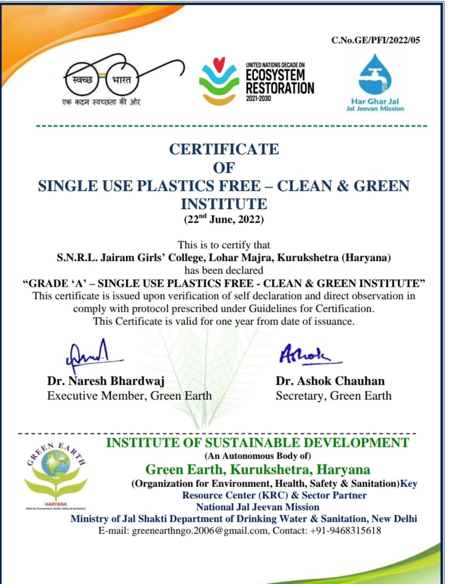 कुरुक्षेत्र। देशभर में संचालित श्री जयराम संस्थाओं के परमाध्यक्ष एवं श्री जयराम शिक्षण संस्थान के चेयरमैन ब्रह्मस्वरूप ब्रह्मचारी की प्रेरणा से ग्रामीण क्षेत्र की कन्याओं को शिक्षित करने के उद्देश्य से संचालित सेठ नवरंग राय लोहिया जयराम कन्या महाविद्यालय लोहार माजरा पूरे हरियाणा का पहला संस्थान है जिसमें गत 18 जून को ग्रीन अर्थ संस्था कुरुक्षेत्र के द्वारा गठित फील्ड असेसमेंट टीम ने पर्यावरण विषय के सन्दर्भ में विजिट किया था। जिसके परिणाम स्वरूप महाविद्यालय को ग्रेड ए सर्टिफिकेट के साथ सिंगल यूज प्लास्टिक फ्री – क्लीन एंड ग्रीन इंस्टिट्यूट घोषित किया गया है। यह एक बहुत बड़ी उपलब्धि है। उल्लेखनीय है कि महाविद्यालय ने ग्रीन अर्थ संस्था के सहयोग से महाविद्यालय को ज़ीरो वेस्ट संस्थान बनाने के उद्देश्य से गीले व सूखे कचरे का प्रबंधन करने के लिए कम्पोस्ट यूनिट तथा एमआरएफ यूनिट तैयार की गई है। पर्यावरण, स्वच्छ भारत मिशन एवं जल जीवन मिशन विषय पर कार्यशाला, व्याख्यान, पोस्टर मेकिंग, स्लोगन लेखन, भाषण आदि प्रतियोगिताओं के माध्यम से जन-जन में पर्यावरण के प्रति जन जागृति उत्पन्न करने का बीड़ा उठा रखा है।