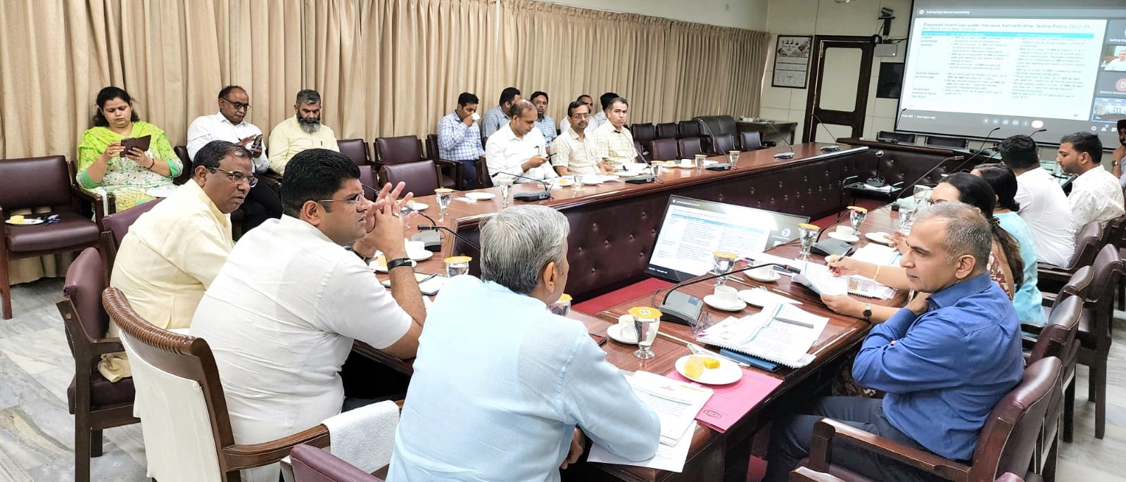 उपमुख्यमंत्री ने बताया कि आज ‘हरियाणा आत्मनिर्भर वस्त्र नीति,2022’ के प्रारूप पर मंत्रिमंडलीय उप समिति द्वारा गहन विचार-विमर्श किया गया है। उन्होंने कहा कि अब इस नीति को अनुमोदन के लिए मंत्रिमंडल के समक्ष प्रस्तुत किया जाएगा और वर्ष 2025 तक की समय अवधि के लिए तैयार की गई इस नीति से करीब चार हजार करोड़ रुपये का निवेश तथा 20 हजार युवाओं को रोजगार मिलने का अनुमान है।