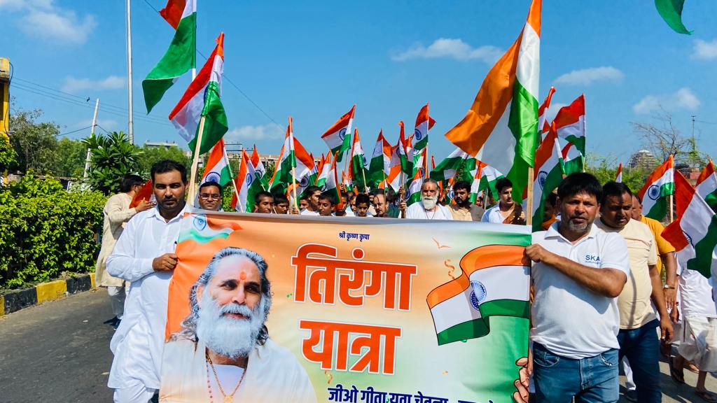 कुरुक्षेत्र। गीता मनीषी स्वामी ज्ञानानंद जी महाराज के सानिध्य में गीता ज्ञान संस्थान में जीओ गीता युवा चेतना तथा श्री कृष्ण कृपा परिवार की ओर से तिरंगा यात्रा का आयोजन किया गया। इस तिरंगा यात्रा में कुरुक्षेत्र विश्वविद्यालय के कुलपति प्रोफेसर सोमनाथ सचदेवा, कुरुक्षेत्र सीएमओ डा. सुखबीर सिंह, युवा भाजपा नेता राहुल राणा ने विशेष रूप से भाग लिया। हाथों में तिरंगा उठाए भारत माता की जय करते हुए तिरंगा यात्रा संस्थान से बीआर चौक तक गई और वापिस गीता ज्ञान संस्थान में आकर संपन्न हुई। इस दौरान वंदे मातरम और भारत माता की जय से वातावरण गूंज उठा। राष्ट्रगान के साथ तिरंगा यात्रा संपन्न हुई। गीता मनीषी स्वामी ज्ञानानंद जी महाराज ने कहा कि तिरंगा भारत का गौरव है। देश की आन बान और शान है। इस तिरंगे के सम्मान के लिए देश के स्वाधीनता आंदोलन में स्वतंत्रता सेनानियों ने अपने प्राण न्योछावर किए लेकिन तिरंगे की आन पर आंच नहीं आने दी। उन्होंने कहा कि तिरंगे का सम्मान भारत के गौरव और भारत की परंपराओं का सम्मान है। तिरंगे का सम्मान राष्ट्र का सम्मान है और उन स्वतंत्रता सेनानियों का सम्मान है जिन्होंने देश की आजादी के लिए अपने प्राण न्योछावर किए।