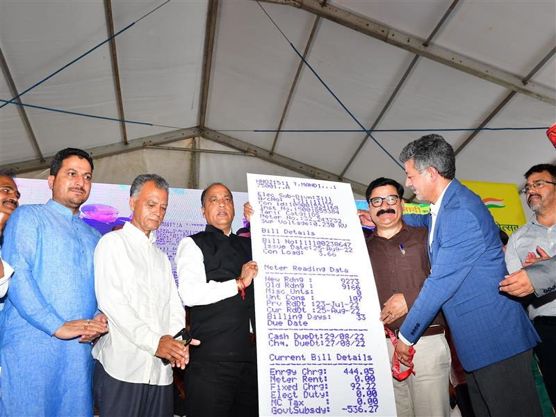 मंडी। मुख्यमंत्री जय राम ठाकुर ने आज मंडी के प्रसिद्ध पड्डल मैदान में हिमाचल प्रदेश राज्य विद्युत बोर्ड लिमिटेड द्वारा आयोजित समारोह की अध्यक्षता करते हुए 125 यूनिट तक मुफ्त बिजली योजना का शुभारंभ किया। उन्होंने कहा कि प्रदेश सरकार ने वर्तमान कार्यकाल के दौरान आम जनता को सीधे तौर पर लाभान्वित करने के लिए ऐसे कई कल्याणकारी निर्णय लिए हैं। उन्होंने कहा कि प्रदेश सरकार ने हाल ही में प्रदेश के लोगों को 125 यूनिट तक मुफ्त बिजली प्रदान करने का निर्णय लिया है, जिससे 14 लाख से अधिक बिजली उपभोक्ता लाभान्वित हो रहे हैं तथा उनके जीरो बिजली बिल आ रहे हैं।