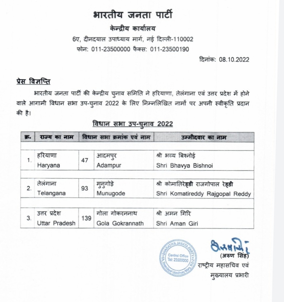 भाजपा ने हरियाणा की आदमपुर सीट सहित आज तीन राज्यों की तीन सीटों के लिए उम्मीदवार घोषित किए हैं। इनमें तेलेंगाना की मुनुगोडे सीट से कोमातिरेड्डी राजगोपाल रेड्डी और उत्तर प्रदेश की गोला गोकरनाथ सीट से अमन गिरी की टिकट फाइनल की है। भाजपा के के राष्ट्रीय महासचिव एवं मुख्यालय प्रभारी अरुण सिंह द्वारा आठ अक्तूबर 2022 को जारी प्रेस विज्ञप्ति में भारतीय जनता पार्टी की केंद्रीय चुनाव समिति द्वारा हरियाणा,तेलेंगाना और उत्तर प्रदेश में होने वाले आगामी विधानसभा उप चुनाव के लिए उपरोक्त नामों की स्वीकृति की सूचना जारी की है।