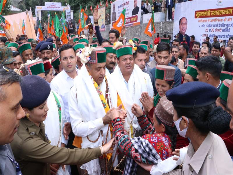 किन्नौर। मुख्यमंत्री जय राम ठाकुर ने आज ‘प्रगतिशील हिमाचल: स्थापना के 75 वर्ष’ कार्यक्रमों की श्रृंखला में किन्नौर जिला के टापरी के समीप छोल्टू में आयोजित समारोह के दौरान किन्नौर विधानसभा क्षेत्र के लिए लगभग 62 करोड़ रुपये लागत की 23 विकासात्मक परियोजनाओं के उद्घाटन व शिलान्यास किए। मुख्यमंत्री ने छोल्टू में विशाल जनसभा को संबोधित करते हुए कहा कि प्रधानमंत्री नरेन्द्र मोदी ने आजादी के 75 वर्ष पूर्ण होने पर देश की स्वतंत्रता में अतुलनीय योगदान देने वाले सेनानियों के प्रति कृतज्ञता व्यक्त करने के लिए हर घर तिरंगा अभियान चलाया जिसे देश सहित हिमाचल में भी अपार समर्थन मिला। उन्होंने कहा कि हिमाचल भी अपने गठन के 75वें वर्ष में प्रवेश कर चुका है और राज्य की उन्नति व समृद्धि में योगदान देने वाले यहां की मेहनतकश व ईमानदार जनता तथा नेतृत्व का आभार व्यक्त करने के लिए ‘प्रगतिशील हिमाचलः स्थापना के 75 वर्ष’ कार्यक्रम राज्य सरकार द्वारा आयोजित किया जा रहा है।