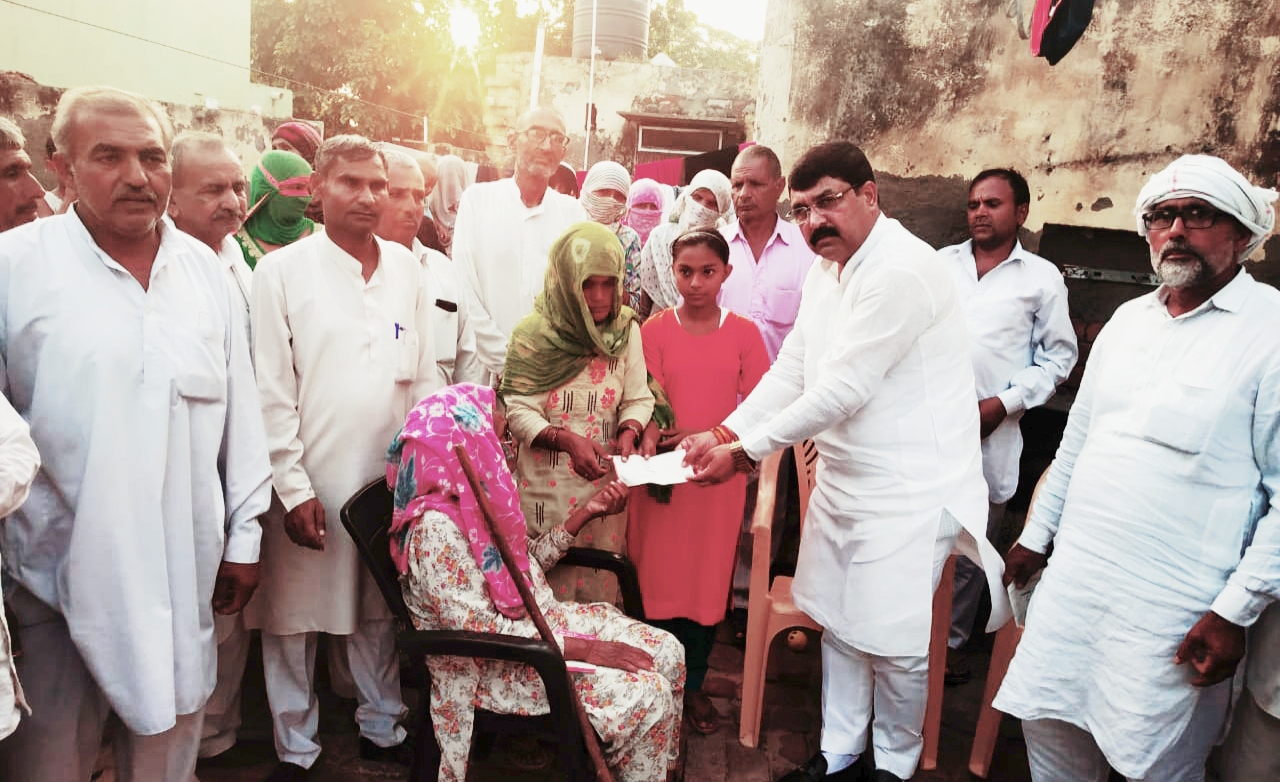 महम। मानवता एवं जनसेवा का उदाहरण देते हुए महम विधायक बलराज कुंडू संकट की घड़ी में एक बार फिर गांव बहलबा के 3 जरूरतमंद परिवारों का सहारा बनकर उनके साथ खड़े हुए हैं। उन्होंने तीनों ही परिवारों को अपनी जेब से ₹ 51-51 हजार रुपये की आर्थिक मदद तो उपलब्ध करवाई ही, साथ ही गांव में ट्राईसाइकिल पर कुल्फी बेचकर किसी तरह परिवार का गुजारा चला रहे दिव्यांग दलित नौजवान प्रदीप की दोनों बेटियों को भी अपने खुद के खर्चे पर पढ़ाने-लिखाने का ऐलान किया है। बता दें कि प्रदीप का एक पैर कटा हुआ है और बीमारी के चलते दूसरे पैर के भी खराब होने की नौबत आई हुई है। फिलहाल उसका रोहतक मेडिकल में ईलाज करवाया जा रहा है। ऐसे में उसके परिवार के सामने गुजारे का ही नहीं दोनों बेटियों की शिक्षा का भी संकट खड़ा नजर आ रहा था कि इस परिवार के बारे में स्थानीय विधायक बलराज कुंडू को जानकारी मिली और मदद करने के जज्बे के साथ कुंडू सीधे प्रदीप के घर पहुंच गए। परिवार से बातचीत करते हुए दोनों बेटियों को खुद के खर्चे पर उच्च शिक्षा दिलवाने का वादा किया और कहा कि पढ़ाई करना तुम्हारा काम है बाकी फीस और कापी किताबों एवं यूनिफॉर्म आदि का सारा खर्च मैं उठाऊंगा।