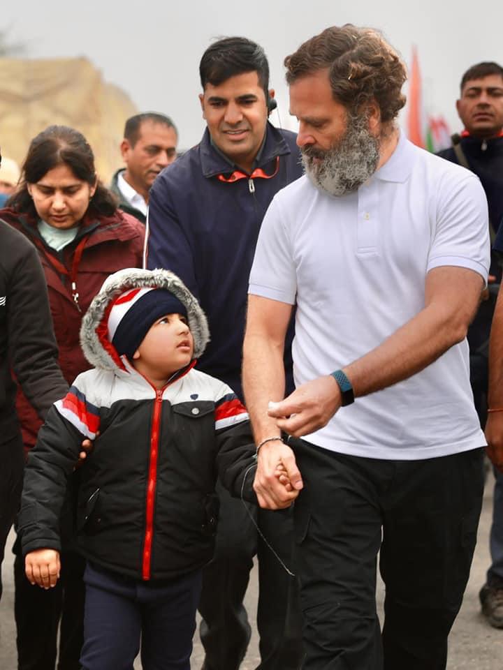 शाहाबाद। जब भारत जोड़ो यात्रा शाहाबाद शहर में प्रवेश करने वाली थी तो नगर के जाने-माने चिकित्सक डॉ. अभिमन्यु अपने 5 वर्षीय पुत्र दक्ष के साथ वहां पर पहुंचे और कांग्रेसी नेताओं को बताया कि उनके बेटे की राहुल गांधी के साथ पदयात्रा करने की इच्छा है। जिस पर कार्यकर्ताओं ने जक्ष को राहुल गांधी के साथ चलाया। और लगभग 10 मिनट जक्ष राहुल गांधी के साथ कदम से कदम मिलाकर चलते रहे। इस दौरान राहुल गांधी ने जक्ष को प्यार भी किया और उनका हालचाल भी जाना। डॉ अभिमन्यु ने राहुल गांधी और सभी कांग्रेसियों का धन्यवाद भी किया।