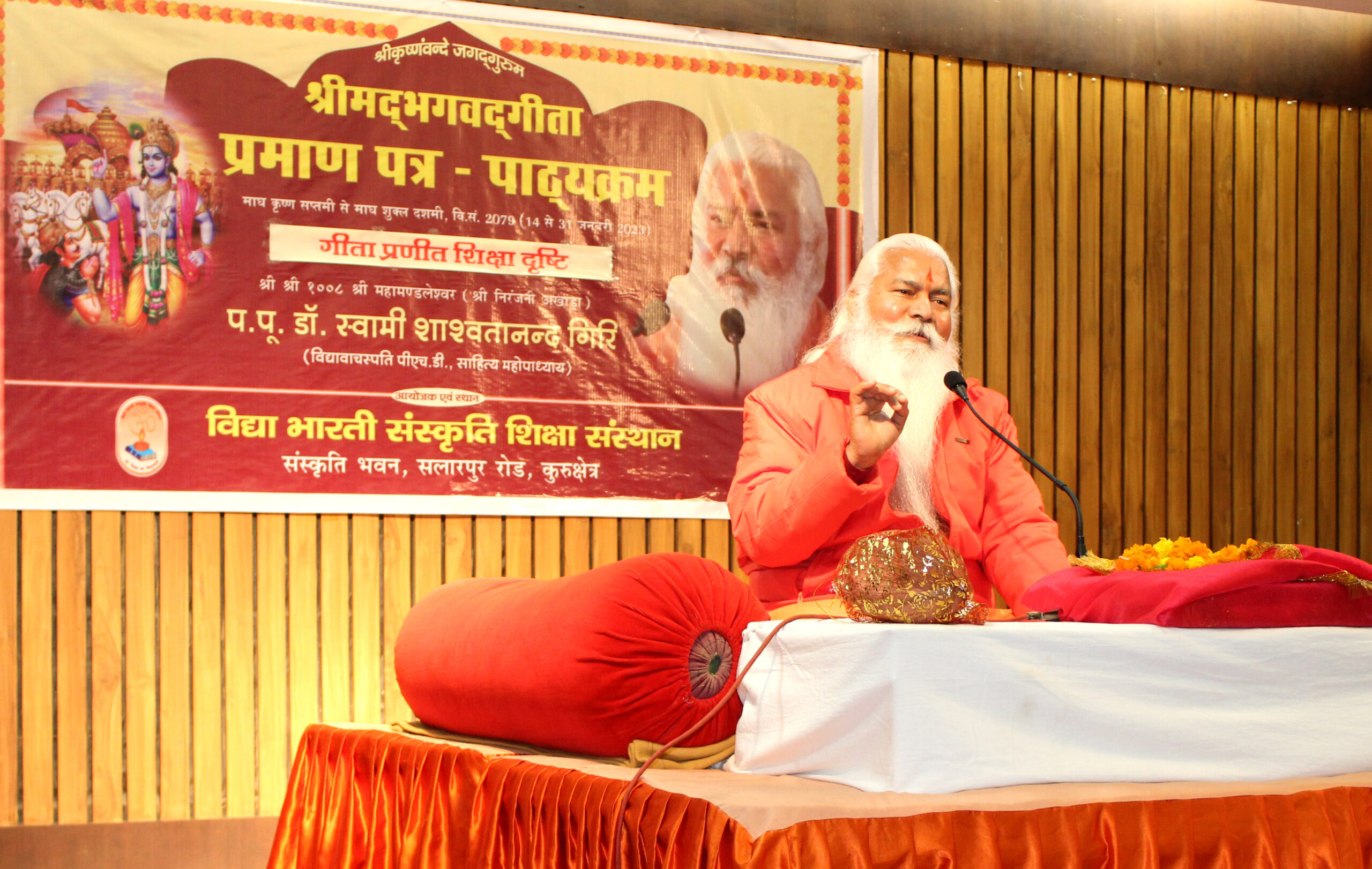 कुरुक्षेत्र। विद्या भारती संस्कृति शिक्षा संस्थान में श्रीमद्भगवद्गीता प्रमाण पत्र पाठ्यक्रम के सातवें दिन ‘गीता प्रणीत शिक्षा दृष्टि’ विषय का शुभारंभ माँ सरस्वती के समक्ष दीप प्रज्ज्वलन से हुआ। संस्थान के निदेशक डॉ. रामेन्द्र सिंह ने बताया कि इस प्रमाण पत्र कोर्स में प्रत्यक्ष एवं देश के अन्य भागों से निरंतर तरंग माध्यम से जुड़ रहे प्रतिभागियों से आभास होता है कि श्रीमद्भगवद्गीता गीता के संदेश को जन-जन तक पहुंचाने का संस्थान का यह प्रयास सफल रहा है।
