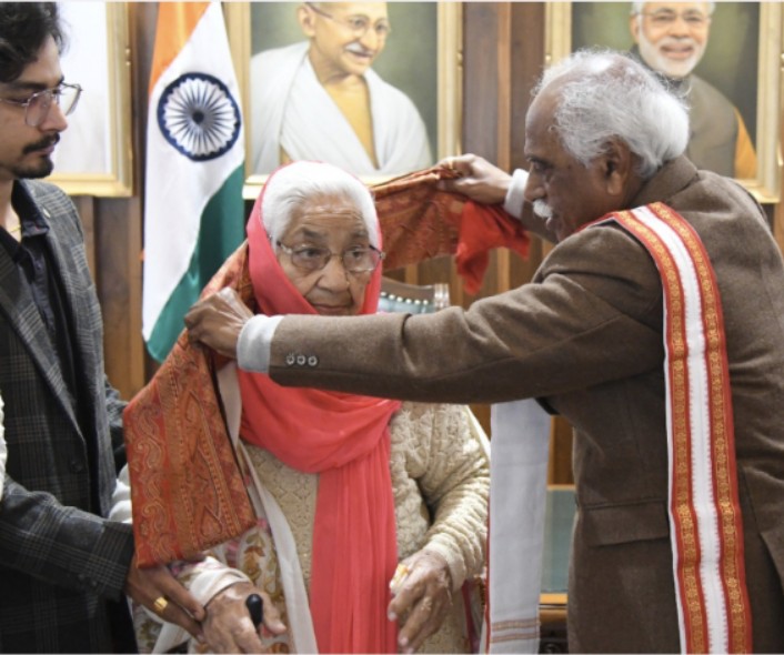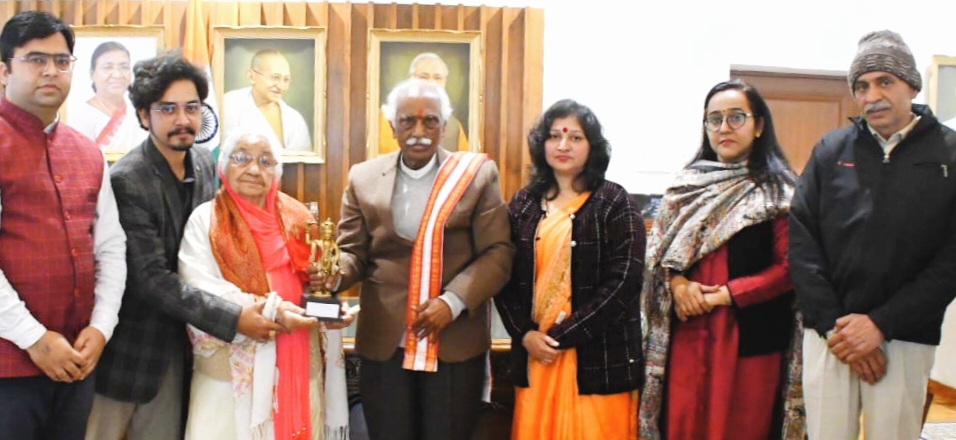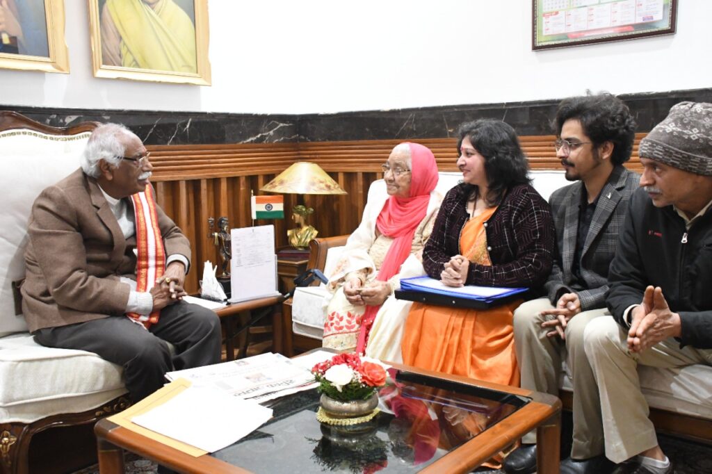 चंडीगढ़। हरियाणा के महामहिम राज्यपाल श्री बंडारू दत्तात्रेय से बुधवार को आजाद हिंद फौज के स्वतंत्रता सेनानियों के परिजनों ने मुलाकात की। राज्यपाल श्री बंडारु दत्तात्रेय ने श्रीमती सीता देवी व श्रीभगवान फौगाट को स्मृति चिन्ह देकर सम्मानित किया। इनमें स्वर्गीय स्वतंत्रता सेनानी श्रीअमरनाथ शर्मा की पत्नी वीरांगना श्रीमती सीता देवी व स्वर्गीय स्वतंत्रता सेनानी राम सिंह फौगाट के पुत्र श्रीभगवान फौगाट व राजेश, कर्तव्यनिष्ठ संस्था के महासचिव अन्नु पसरिचा व उज्जवल वर्मा उपस्थित रहे।
