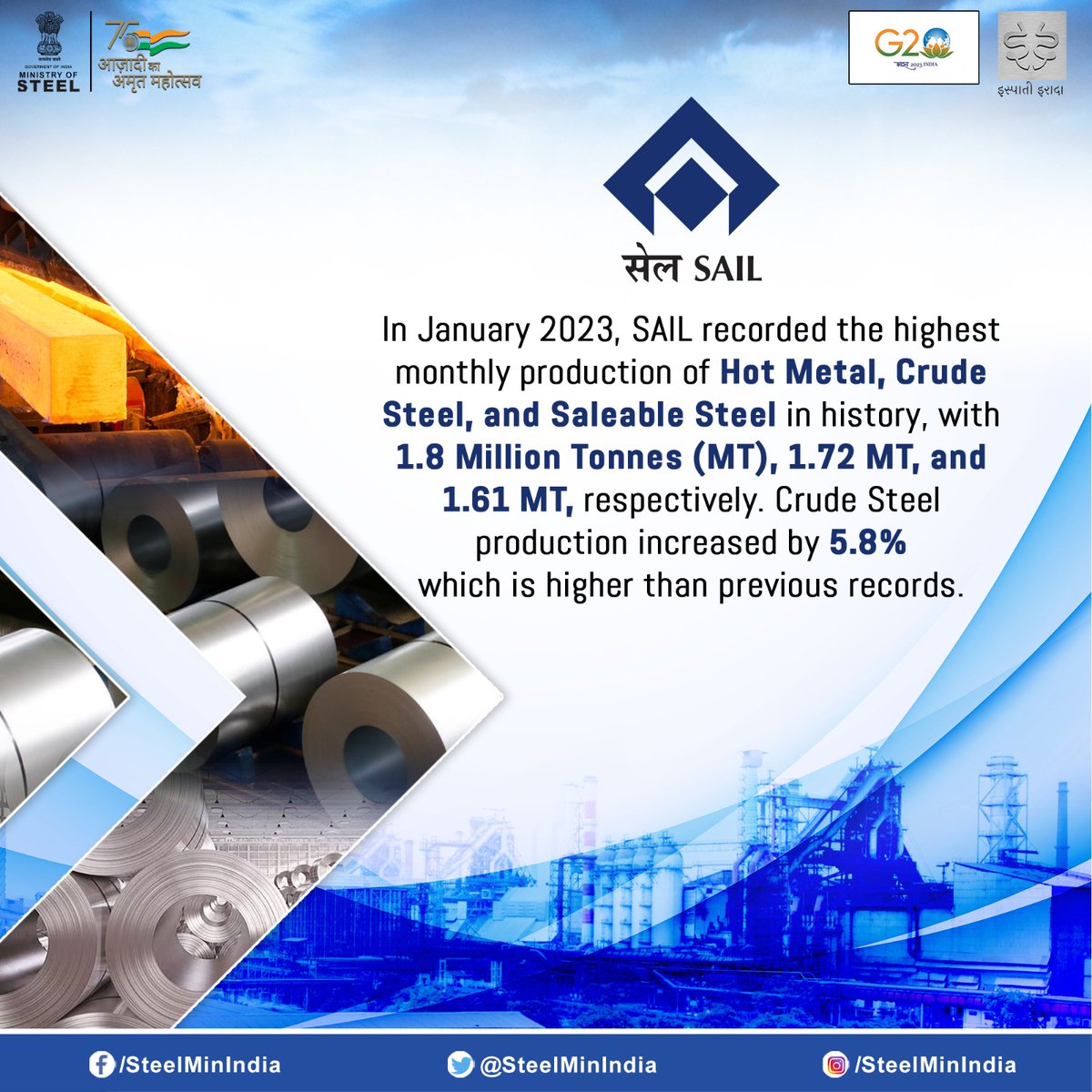 दिल्ली। प्रधानमंत्री नरेंद्र मोदी ने जनवरी 2023 में एक महीने में ढलुआ धातु, कच्चे इस्पात और बिक्री योग्य ठोस इस्पात का सर्वाधिक ऐतिहासिक उत्पादन अर्जित करने पर स्टील अथॉरिटी ऑफ इंडिया की सराहना की है। इस्पात मंत्रालय के ट्वीट के प्रत्युत्तर में प्रधानमंत्री ने ट्वीट किया “भारत के आत्मनिर्भर बनने के लिये महत्त्वपूर्ण सेक्टर से उत्साहवर्धक समाचार।”