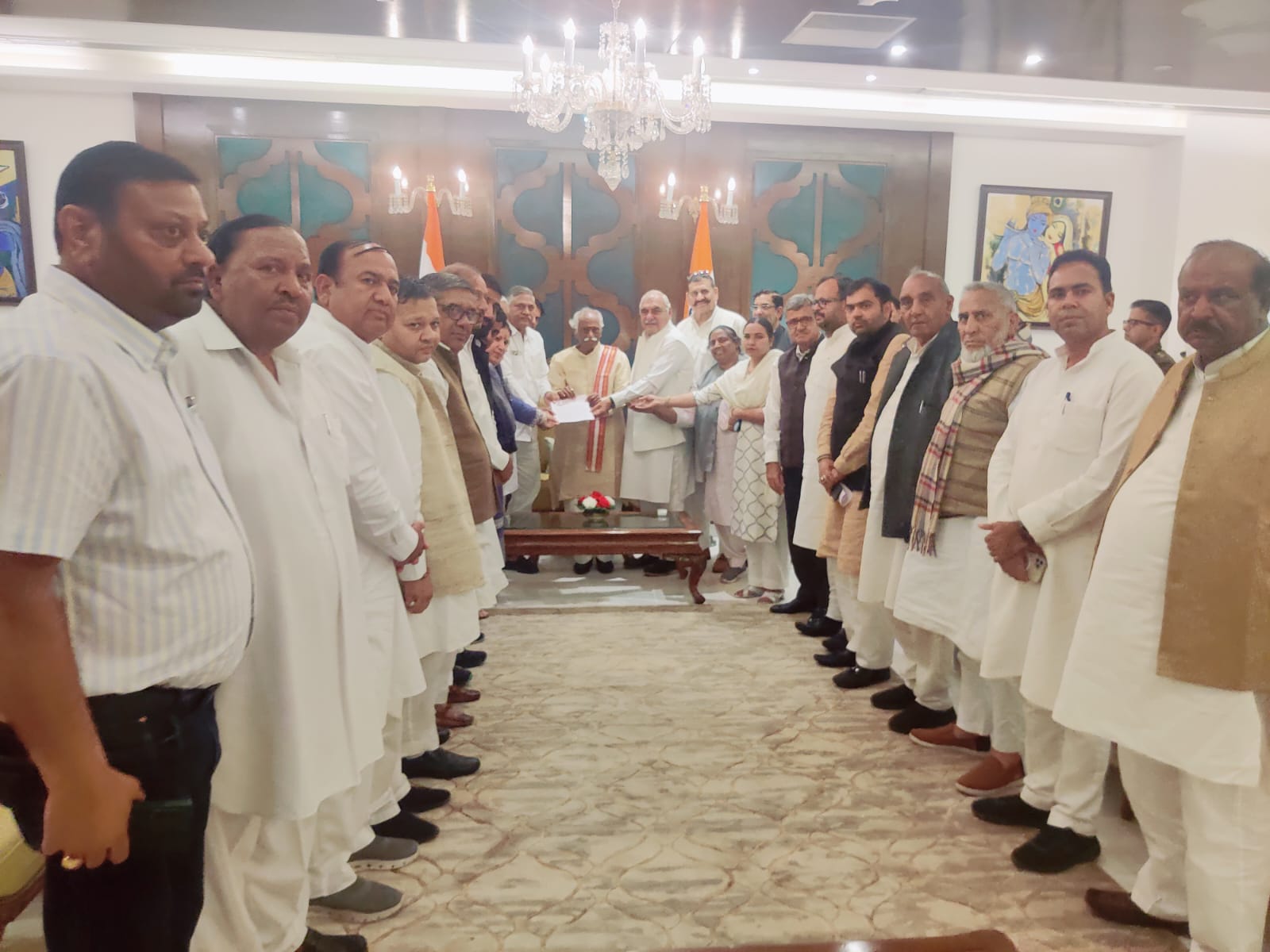 चंडीगढ़ । पूर्व मुख्यमंत्री और नेता प्रतिपक्ष भूपेंद्र सिंह हुड्डा व प्रदेश अध्यक्ष चौधरी उदयभान के नेतृत्व में आज हरियाणा कांग्रेस विधायकों ने ई-टेंडरिंग, बढ़ते भ्रष्टाचार, बेरोजगारी और अपराध के खिलाफ माननीय राज्यपाल को ज्ञापन सौंपा। ज्ञापन में कहा गया है कि जनता के प्रति बीजेपी-जेजेपी सरकार की हिंसक प्रवृत्ति बढ़ती जा रही है। चंद दिनों के भीतर सरकार ने पहले कर्मचारियों और फिर पंच-सरपंचों पर निर्दयतापूर्ण लाठीचार्ज किया। जबकि कर्मचारी पुरानी पेंशन स्कीम की मांग और पंचायत प्रतिनिधि ई-टेंडरिंग के खिलाफ शांतिपूर्ण प्रदर्शन कर रहे थे। दोनों की मांग व प्रदर्शन पूरी तरह जायज व संवैधानिक थे। लेकिन सरकार ने उनके संवैधानिक अधिकारों को कुचलने के लिए निरंकुश रवैया अपनाया। जनता को अपनी शिकायत व समस्या को उठाने पर लाठी और गोली का सामना करना पड़े तो सरकार को लोकतांत्रिक कहलाने का अधिकार नहीं है। ज्ञापन में मांग की गई है कि सरकार जनप्रतिनिधियों से संवाद करके पंचायतों को उनके संवैधानिक अधिकार वापिस दे और उनपर दर्ज किए गए केस तुरंत वापस ले।