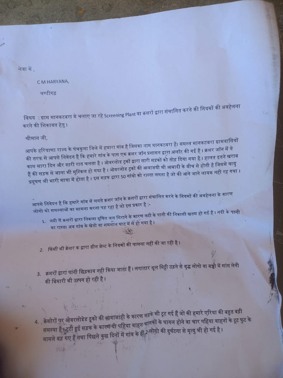 पंचकूला। पंचकूला जिले के मानकटबरा क्रशर जोन में चल रहे स्टोन क्रशर नियमों का पालन नहीं कर रहे हैं। जिस कारण यहां के लोगों का जीना मुहाल हो गया है। जिला प्रशासन के अधिकारियों द्वारा इन स्टोन क्रशरों पर नकेल नहीं डालने से परेशान हुए लोगों ने अब प्रधानमंत्री नरेंद्र मोदी, गृहमंत्री, एनजीटी तथा प्रदेश के मुख्यमंत्री को पत्र लिखकर क्रशर मालिकों के खिलाफ कार्रवाई की मांग की है। जिला परिषद के सदस्य एडवोकेट बलविंदर चौधरी तथा कृष्ण गोपाल बंटी वालिया ने गांव वासियों की तरफ से यह पत्र जारी करते हुए बताया कि सरकार द्वारा अलॉट क्रशर जोन में दिन-रात काम चलता है। यहां एनजीटी द्वारा तय किए गए किसी भी नियम का पालन नहीं हो रहा है। क्रशर मालिक कभी-कभार ही फव्वारे चलाते हैं। जिस कारण यहां दिन रात धूल उड़ती रहती है। इस धूल के कारण लोगों को जहां सांस की बीमारियां होने लगी हैं वहीं अब यह धूल उडक़र घरों में गिरने लगी है।