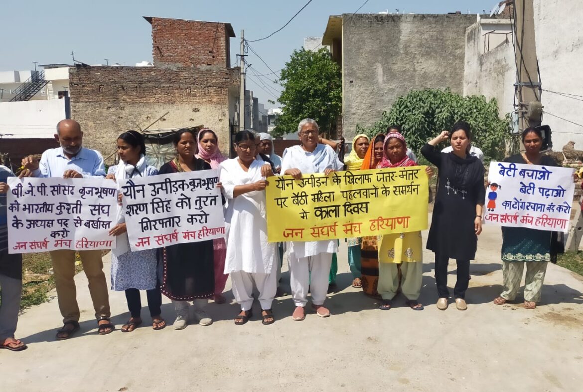 मंच नेताओं ने कहा कि इस वर्ष जनवरी से लेकर इन अंतर्राष्ट्रीय ख्याति प्राप्त महिला खिलाड़ियों ने मुखर होकर भारतीय कुश्ती संघ के प्रधान व सत्ता धारी पार्टी भाजपा के सांसद की अश्लील यौन हरकतों के खिलाफ आवाज उठाई व मांग की कि आरोपी के खिलाफ सख्त से सख्त कानूनी कार्रवाई करें व इसे भारतीय कुश्ती संघ से बाहर निकालें ताकि निष्पक्ष माहौल में जांच प्रक्रिया चलाई जा सके। आज तक यानी इस संघर्ष को पांचवां महीना चल रहा है और अपराधी अभी भी सत्तारूढ़ पार्टी भाजपा के संरक्षण में अपने शक्तिशाली ओहदे का फायदा उठा रहा है और अब तक जेल भी नहीं भेजा गया है, इसलिए आज काला दिवस मनाया गया है। बेटी बचाओ बेटी बढ़ाओ का नारा छोड़ कर अब सरकार ने यौन अपराधियों को बचाओ और यौन अपराधियों को बढ़ाओ का नारा दे दिया है। बिल्किस बानो के अपराधियों को समय से पहले मुक्त कर देना व बृजभूषण शरण सिंह को पोक्सो एक्ट में भी अभी तक गिरफ्तार न करना इसके पुख्ता सबूत हैं।
