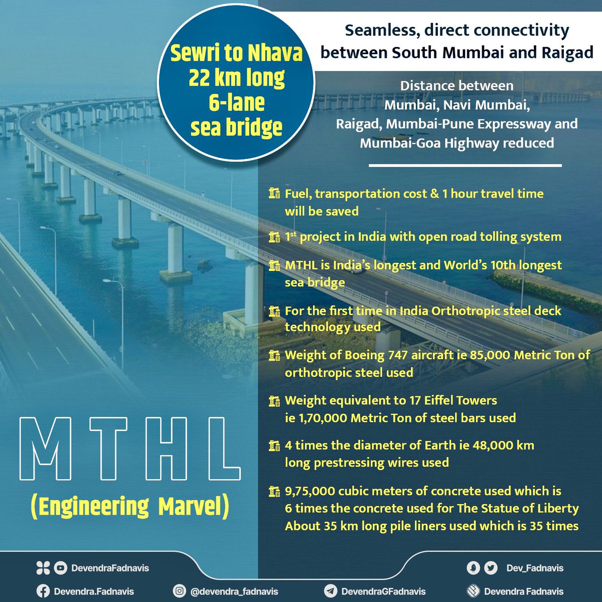 दिल्ली। प्रधानमंत्री नरेंद्र मोदी ने भारत के सबसे लंबे समुद्री पुल मुंबई ट्रांस हार्बर लिंक (एमटीएचएल) पर प्रसन्नता व्यक्त की और कहा कि यह अगली पीढ़ी की अवसंरचना है, जो लोगों के लिए ‘जीवन यापन में आसानी’ को बढ़ावा देगी। एमटीएचएल की विशेषता के बारे में महाराष्ट्र के उपमुख्यमंत्री देवेंद्र फडणवीस के ट्वीट के जवाब में प्रधानमंत्री ने ट्वीट किया कि “अगली पीढ़ी की अवसंरचना, जो लोगों के लिए ‘जीवन यापन में आसानी’ को बढ़ावा देगी।”