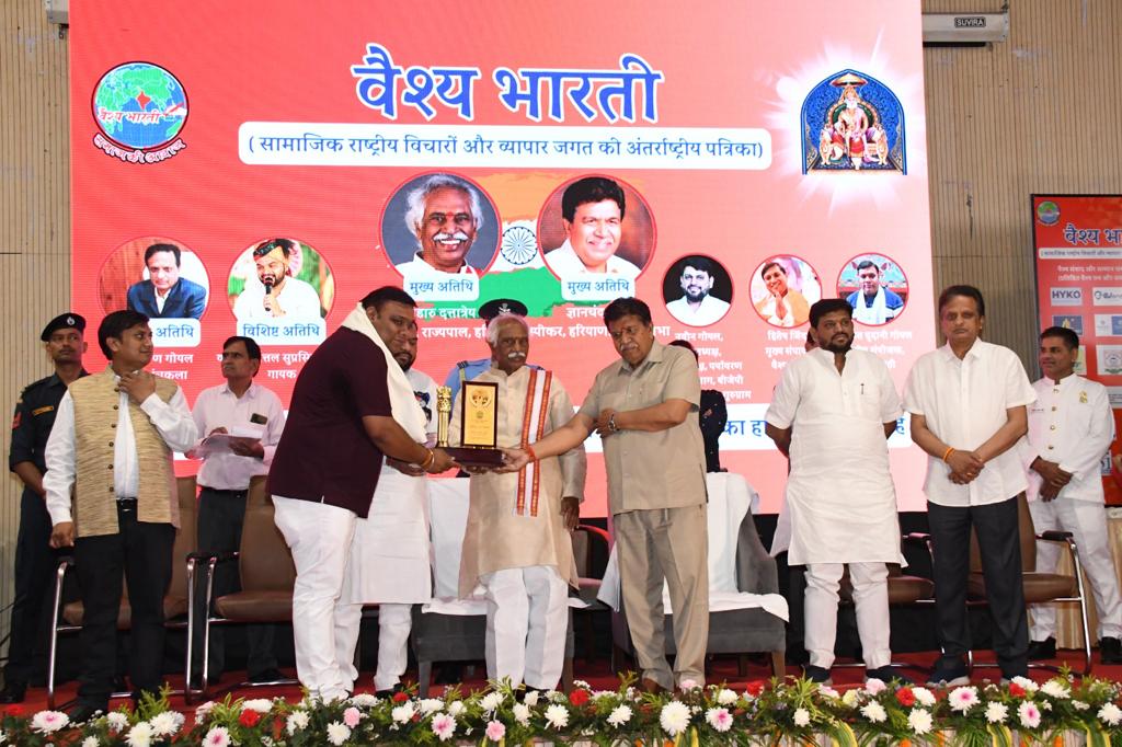 इस अवसर पर बंडारू दत्तात्रेय और ज्ञानचंद गुप्ता ने यूपीएससी की परीक्षा में हरियाणा में टाप और देश में 9वां रैंक हासिल करने वाली हरियाणा की बेटी कनिका गोयल सहित विभिन्न क्षेत्रों में उल्लेखनीय योगदान देने वाले मेधावी छात्रों, समाज सेवियों, उद्यौगपतियों, महिलाओं और मीडिया बंधुओं को स्मृति चिन्ह देकर सम्मानित किया। वैश्य भारती राष्ट्रीय पत्रिका के राष्ट्रीय संयोजक श्री अंकित दुदानी गोयल को मीडिया रतन अवार्ड से सम्मानित किया गया। इस मौके पर दत्तात्रेय और ज्ञानचंद गुप्ता ने वैश्य भारती पत्रिका के हरियाणा संस्करण का विमोचन भी किया।