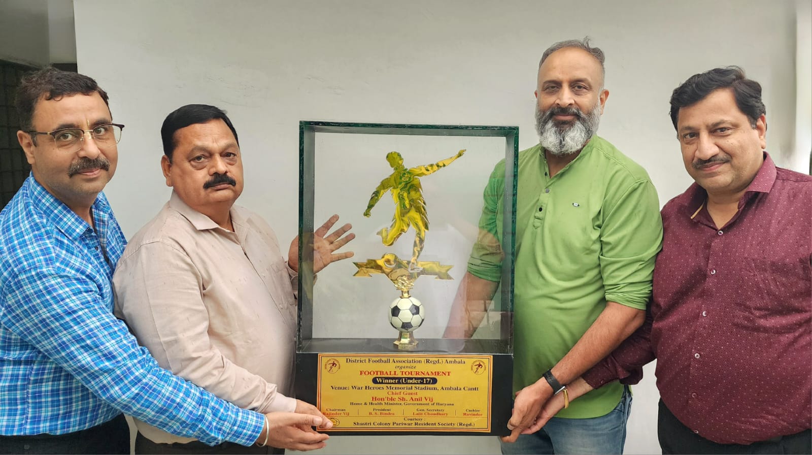 कपिल विज बुधवार को जिला फुटबाल संघ अम्बाला द्वारा आयोजित अंडर 14 व अंडर 17 जिलास्तरी फुटबाल प्रतियोगिता की ट्राफी के अनावरण समारोह में बोल रहे थे। उन्होंने बताया कि शास्त्री कालोनी परिवार रेजिडेंट सोसाइटी वार हीरोज स्टेडियम में आयोजित प्रतियोगिता को आफिशियल तौर पर प्रायोजित कर रही है। सोसाइटी द्वारा प्रतियोगिता की विजेता और रनर अप ट्राफी के अलावा 64 खिलाड़ियों, आठ मैच रेफरी एवं अन्य के लिए स्मृति चिन्ह प्रायोजित कर उन्हें प्रोत्साहित कर रही है।
