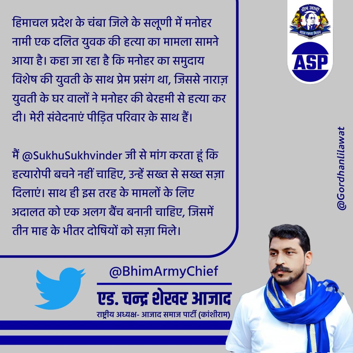 भीम आर्मी के प्रमुख चंद्रशेखर ने इस मामले में ट्वीट किया है। उन्होंने लिखा है कि हिमाचल प्रदेश के चंबा जिले के सलूणी में मनोहर नामी एक दलित युवक की हत्या का मामला सामने आया है। कहा जा रहा है कि मनोहर का समुदाय विशेष की युवती के साथ प्रेम प्रसंग था, जिससे नाराज़ युवती के घर वालों ने मनोहर की बेरहमी से हत्या कर दी। मेरी संवेदनाएं पीड़ित परिवार के साथ हैं। उन्होंने लिखा कि मैं मुख्यमंत्री से मांग करता हूं कि हत्यारोपी बचने नहीं चाहिए, उन्हें सख्त से सख्त सज़ा दिलाएं। साथ ही इस तरह के मामलों के लिए अदालत को एक अलग बैंच बनानी चाहिए, जिसमें तीन माह के भीतर दोषियों को सज़ा मिले।