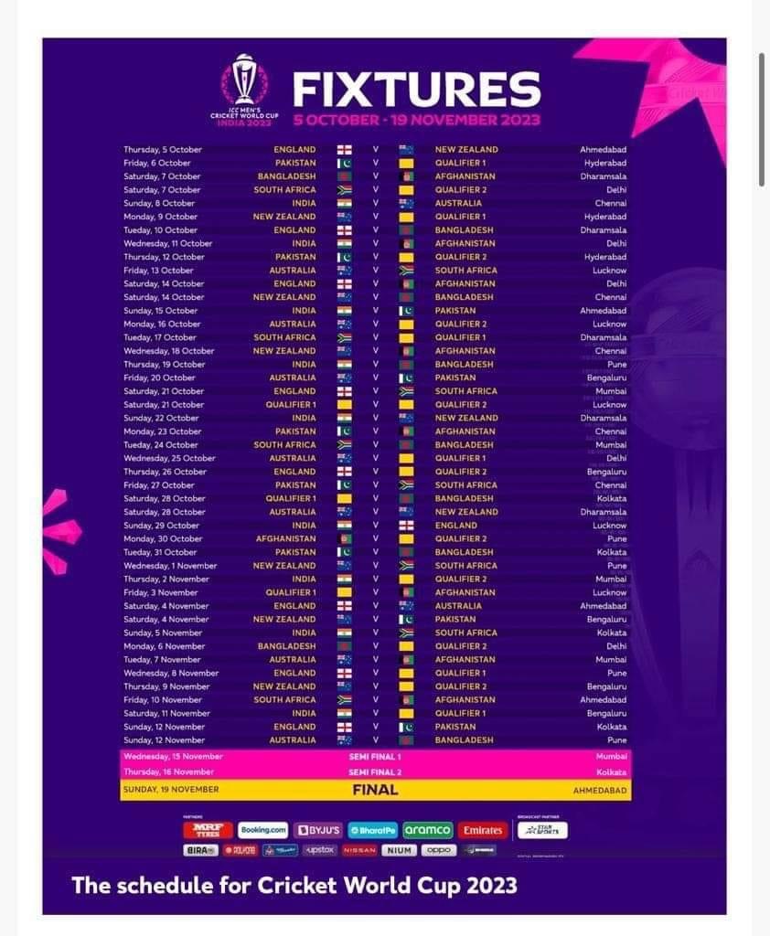 चंडीगढ़/धर्मशाला। मंगलवार को क्रिकेट विश्व कप का शैड्यूल जारी हो गया है। भारत के हिस्से में 48 मैच आए हैं,जोकि विश्व के सबसे सुंदर स्टेडियम धर्मशाला सहित 10 शहरों में होंगे । मंगलवार को आईसीसी ने क्रिकेट वनडे वर्ल्ड कप 2023 का शैड्यूल जारी कर दिया है। एचपीसीए स्टेडियम धर्मशाला में कुल पांच मैच होंगे और यहां पर पहला मैच 7 अक्टूबर को होगा बांग्लादेश और अफगानिस्तान के बीच होगा। इस के बाद इसी स्टेडियम में 10 अक्टूबर को इंग्लैड व बांग्लादेश की टीमें भिड़ेंगी। 17 अक्टूबर को पहला क्वालीफायर मैच साउथ अफ्रीका के खिलाफ,जबकि 22 अक्टूबर टीम इंडिया न्यूजीलैंड टीमें भिड़ेगी। विश्व के इस सबसेआ आज मैदान में आखिरी मैच 28 अक्टूबर को आस्ट्रेलिया व न्यूजीलैंड के मध्य होना है। इससे पहले वर्ल्ड कप के मैचों को लेकर स्टेडियम में तैयारियां जोरशोर से चल रही हैं।