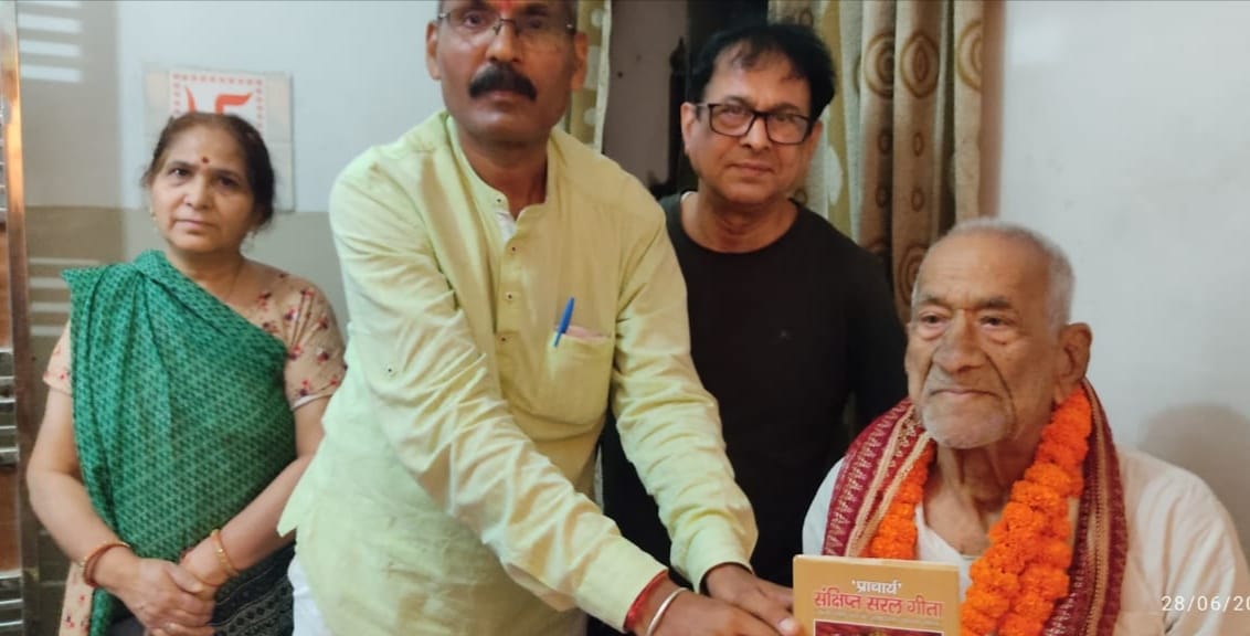 नारनौल। स्वच्छ भारत मिशन हरियाणा सरकार द्वारा लोकतंत्र की रक्षा हेतु पखवाड़ा कार्यक्रमों के अंतर्गत सांयकाल नारनौल की पुरानी कचहरी मैदान में श्यामसुंदर पुरोहित 92 वर्ष के नेतृत्व में भोलाराम आर्य, चंद्र प्रकाश बुध देव यादव,महाशय दयाराम आदि सात साथियों के साथ आंदोलन कर नारनौल क्षेत्र में सर्वप्रथम गिरफ्तारी देने और यातनाएं सहने पर उनके चांदूवाड़ा, नारनौल स्थित आवास पर पर अंग वस्त्र,धार्मिक ग्रंथ गीता, पुष्पगुच्छ और ग्रीन नारनौल कली नारनौल अभियान के सौजन्य से तुलसी का पौधा भेंटकर सम्मानित किया गया और उनके उत्तम स्वास्थ्य लाभ हेतु कामना की गई। इस दौरान उन्होंने आंदोलन के दौरान घोर यात्नाओं के संस्मरण भी सुनायें।इस अवसर पर मंडल अध्यक्ष मनीष संघी ने कहा लोकतंत्र की रक्षा हेतु मां भारती से जुड़ कर आंदोलन करने में श्यामसुंदर पुरोहित सबसे अग्रणी रहते थे। वयोवृद्ध समाजसेवी कैलाश पूर्व सरपंच मित्रपुरा ने कहा लोकतंत्र की रक्षा हेतु नारनौल के समाजसेवियों ने महत्वपूर्ण भूमिका निभाई।