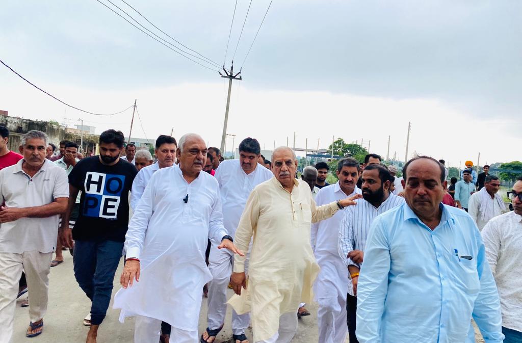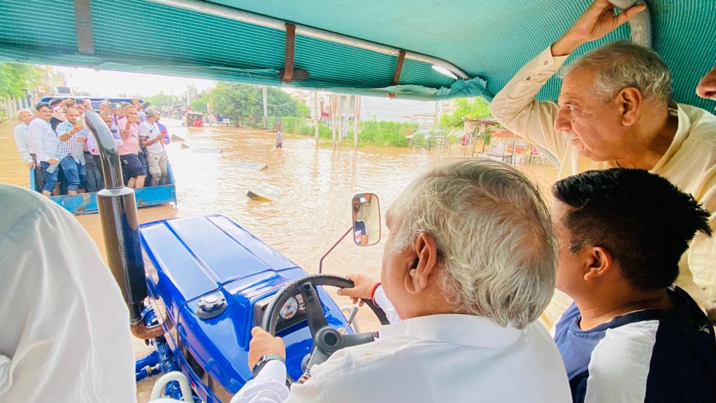 कुरुक्षेत्र। पूर्व मुख्यमंत्री और नेता प्रतिपक्ष भूपेंद्र सिंह हुड्डा ने आज बाढ़ ग्रस्त इलाकों का दौरा किया। हुड्डा और पूर्व मंत्री अशोक अरोड़ा ने ट्रैक्टर पर और पैदल चलकर कुरुक्षेत्र के गांव नरकातारी, ठोल, दुराला, झांसा, टीबा, उदारसी, झीवहेडी, हंसाला,खेड़ी मारकंडा, हिंगोखेड़ी और शाहबाद में पहुंचे। उन्होंने लोगों से बातचीत कर उनकी परेशानी जानी और अधिकारियों से बात कर जल्द समाधान के निर्देश दिए। इसके बाद उन्होंने कुरुक्षेत्र से लेकर शाहबाद और आगे अंबाला तक उन्होंने खेतों व रिहायशी इलाकों की स्थिति देखी। हुड्डा ने बताया कि जलभराव ने भयानक रूप ले लिया है। इससे निपटने के लिए सरकार को युद्ध स्तर पर काम करना होगा। प्रदेश सरकार को ज्यादा से ज्यादा केंद्र, एनडीआरएफ और सेना की मदद से राहत कार्य आगे बढ़ाना चाहिए। ताकि लोगों के जानमाल की रक्षा की जा सके।