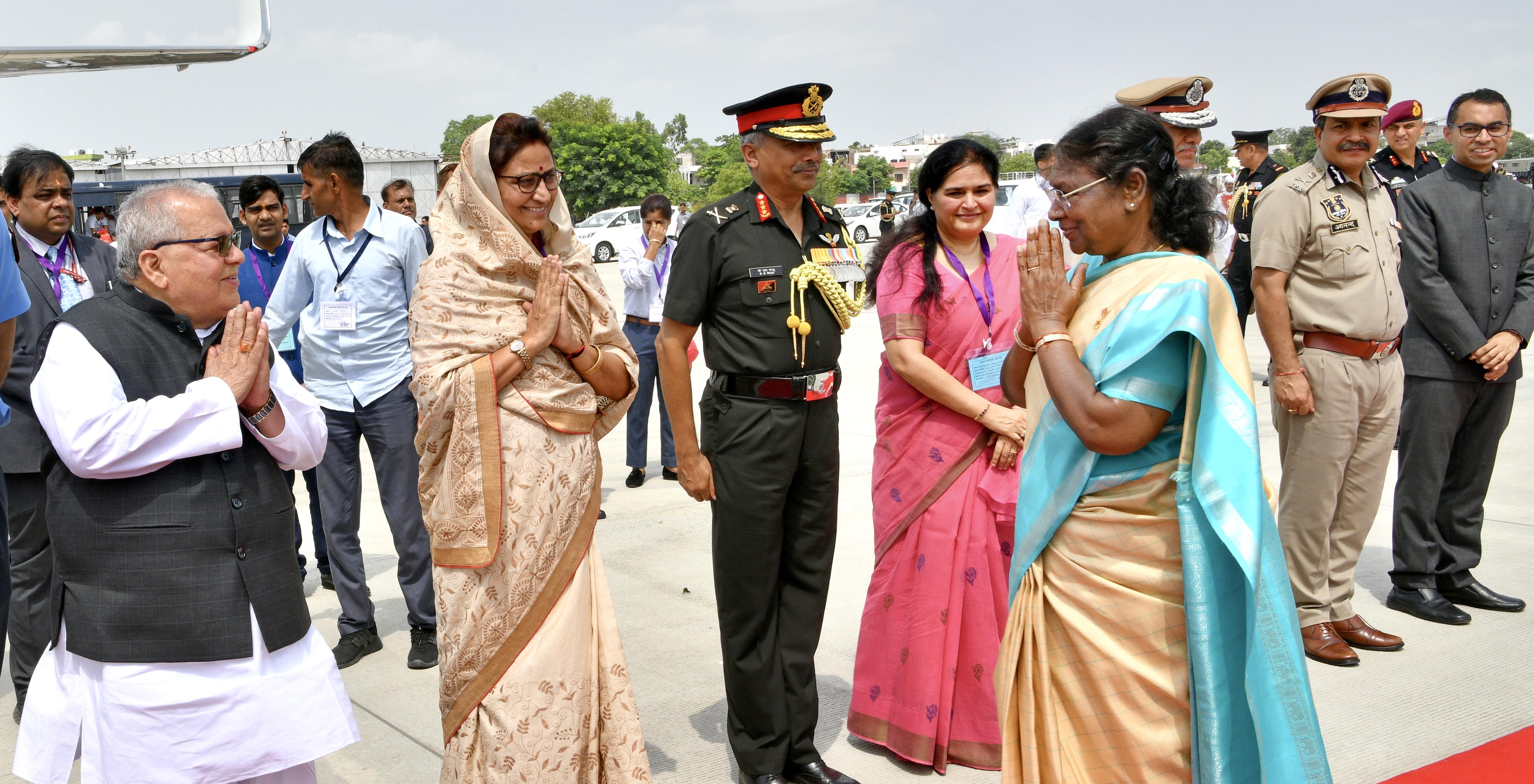 जयपुर। राज्यपाल श्री कलराज मिश्र ने राष्ट्रपति द्रौपदी मुर्मु को शनिवार को राजस्थान यात्रा संपन्न होने पर सांगानेर एयरपोर्ट पर भावभीनी विदाई दी। राज्य की प्रथम महिला सत्यवती मिश्र, उद्योग मंत्री शकुंतला रावत, मुख्य सचिव उषा शर्मा ने भी राष्ट्रपति मुर्मु को विदाई दी ।