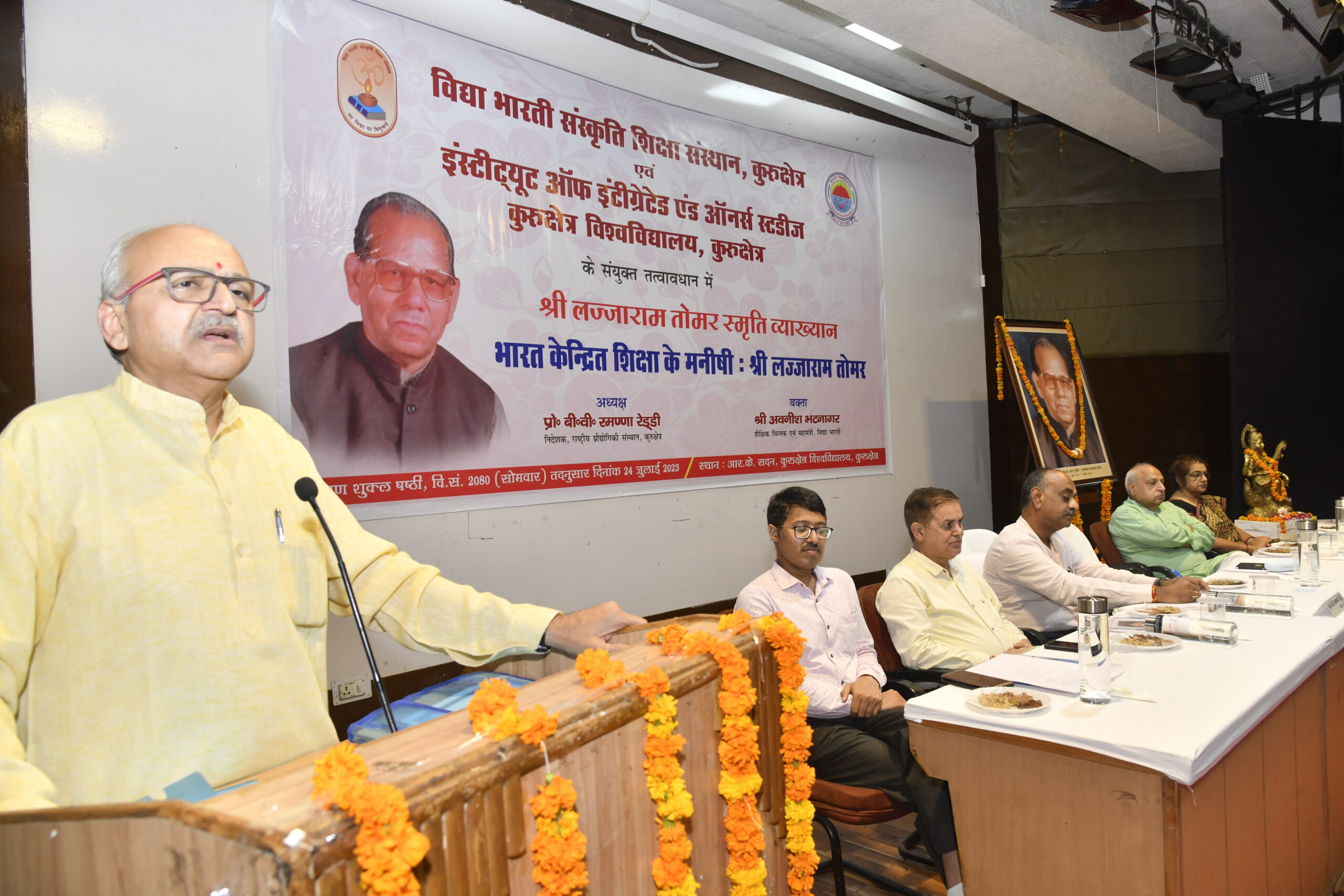 कुरुक्षेत्र । विद्या भारती संस्कृति शिक्षा संस्थान एवं इंस्टीट्यूट ऑफ इंटीग्रेटेड एंड ऑनर्स स्टडीज, कुरुक्षेत्र विश्वविद्यालय के संयुक्त तत्वावधान में श्री लज्जाराम तोमर स्मृति व्याख्यान का आयोजन कुरुक्षेत्र विश्वविद्यालय के आर.के. सदन में किया गया। व्याख्यान का विषय ‘‘भारत केन्द्रित शिक्षा के मनीषी: श्री लज्जाराम तोमर’’ रहा। कार्यक्रम में वक्ता शैक्षिक चिन्तक एवं विद्या भारती के महामंत्री अवनीश भटनागर रहे एवं अध्यक्षता राष्ट्रीय प्रौद्योगिकी संस्थान, कुरुक्षेत्र के निदेशक प्रो. बी.वी. रमण्णा रेड्डी ने की। मंचासीन अन्य अतिथियों में वि.भा.संस्कृति शिक्षा संस्थान के अध्यक्ष डॉ. ललित बिहारी गोस्वामी, आई.आई.एच.एस. की प्राचार्या प्रो. रीटा एवं कार्यक्रम संयोजक डॉ. रामचन्द्र तथा देसराज शर्मा उपस्थित रहे। वि.भा. संस्कृति शिक्षा संस्थान के निदेशक डॉ. रामेन्द्र सिंह ने अतिथि परिचय तथा स्वागत करते हुए कहा कि इस प्रकार की शैक्षिक विचार गोष्ठियों का आयोजन लज्जाराम तोमर जी की ही कल्पना थी। राष्ट्रीय शिक्षा नीति में जिन-जिन पहलुओं को आधार बनाया गया है, वह कल्पना तोमर के मन-मस्तिष्क में लगभग 30 वर्ष पूर्व थी, जिसका सजीव प्रमाण उनके द्वारा लिखित अनेक पुस्तकों में मिलता है। मंच संचालन दुर्ग सिंह राजपुरोहित एवं डॉ. रामचंद्र ने किया।