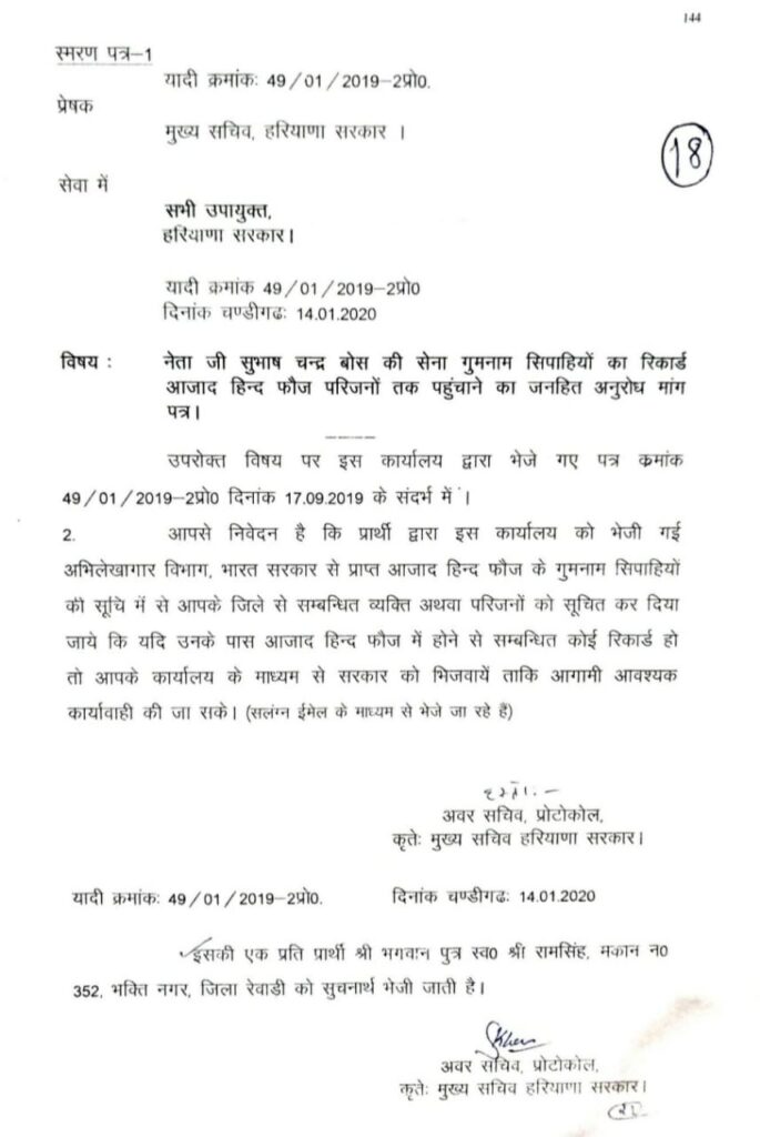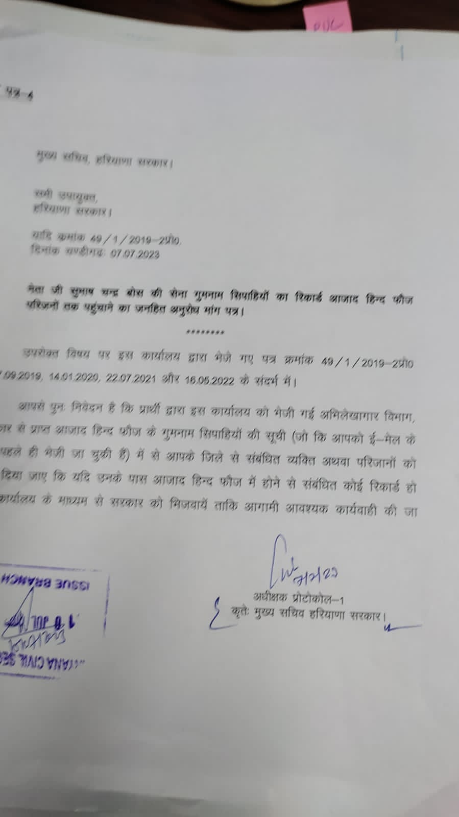 रेवाड़ी। आजाद हिंद फौज के शहीद एवं गुमनाम स्वतंत्रता सेनानियों के हक की लड़ाई लड़ रहे लंबे समय से लड़ रहे श्रीभगवान फौगाट ने मांग रखी है कि मुख्यमंत्री मनोहर लाल को अपने जन संवाद कार्यक्रमों के दौरान इस समस्या को भी सुन कर हल करना चाहिए। उन्होंने कहा कि हरियाणा के मुख्य सचिव सभी जिला उपायुक्तों को स्वतंत्रता सेनानियों के केसों की फाइल भेजने के लिए कह चुके हैं,लेकिन आज तक इन पर कोई काम नहीं हुआ। उन्होंने मुख्य सचिव द्वारा भेजे के पत्रों को मीडिया से साझा करते हुए बताया कि संस्कृति मंत्रालय के राष्ट्रीय अभिलेखागार से मिले रिकॉर्ड आजाद हिंद फौज नामिनल रोल के आधार पर राज्य सैनिकों और शहीद सैनिकों को स्वतंत्रता सेनानी दर्जा देने के लिए केस फाइल करने संबंधी छह वर्षों से पांच बार सभी जिला कलेक्टरों को पत्र मुख्य सचिव स्वतंत्रता सेनानी विभाग द्वारा लिख चुके हैं।फौगाट के मुताबिक हाल ही में 7 जुलाई 2023 को भी लिखा गया है एवं जिला कष्ट निवारण कमेटी के सामने पुनः बार बार फिर से इस विषय में पक्ष रखा जा चुका है। उन्होंने बताया कि सीएम विंडो पर भी इस संदर्भ में शिक़ायतें भेजी जा चुकी है, लेकिन कोई परिणाम सामने नहीं आया है, जबकि परिवारों तक रिकॉर्ड भी नहीं पहुंच पा रहा है। हरियाणा के भी ऐसे कई गुमनाम एवं अमर शहीद सैनिक है। यदि संबंधित क्षेत्रों के राजनेता, सामाजिक संगठन, प्रशासनिक अधिकारी,आम जनता से मानवीय आधार पर मुख्यमंत्री के सामने जनसंवाद कार्यक्रम में नेता जी सुभाष चन्द्र बोस कि सेना में रहें गुमनाम सैनिकों को स्वतंत्रता सेनानी दर्जा देने का पक्ष रखने का समय एक मिनट दिलाकर अतिमहत्वपूर्ण मदद करें तो बेहतर होगा। श्रीभगवान फौगाट ने यह भी बताया कि यदि ऐसे सैनिकों को स्वतंत्रता सेनानी दर्जा दिलाने में सफल रहे तो निश्चित रूप से वह अन्य राज्यों के भी ऐसे सैनिकों का रिकॉर्ड ढुंढने का भी हर संभव प्रयास करेंगे ।