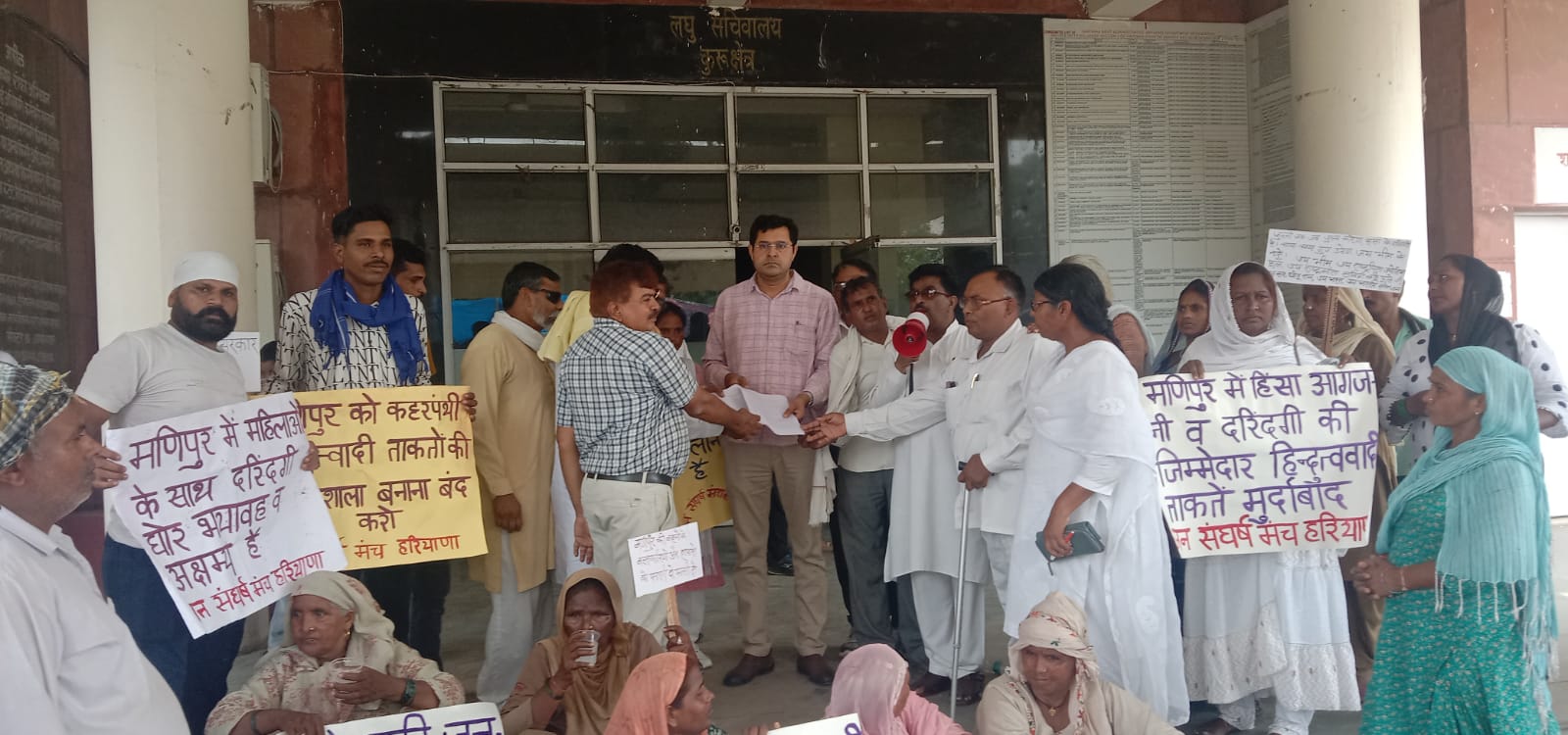 न्यूज़ डेक्स संवाददाता कुरुक्षेत्र । आज जन संघर्ष मंच हरियाणा के साथीगण, थानेसर नगर परिषद के सफाई कर्मचारी महिलाओं व नागरिकों ने मणिपुर के जनसंहार, नग्न परेड सामूहिक बलात्कार हत्या संबंधी बीभत्स घटनाओं के खिलाफ आक्रोश प्रदर्शन किया। यह आक्रोश प्रदर्शन सैणी समाज भवन कुरुक्षेत्र से शुरू होकर गुरू रविदास मंदिर, डॉ भीमराव अम्बेडकर चौक, बस अड्डा थानेसर, मोहन नगर चौक से होते हुए मिनी सचिवालय कुरुक्षेत्र पहुंचा और धरने में बदल गया। समस्त नागरिक समाज व जन संघर्ष मंच हरियाणा की ओर से सीटीएम कुरुक्षेत्र के माध्यम से राष्ट्रपति जी को ज्ञापन दिया गया। ज्ञापन में मांग की गई कि मणिपुर में दंगाई भीड द्वारा महिलाओं पर सामूहिक बलात्कार नग्न परेड व हत्या करने वाले सभी दरिंदों पर सख्त से सख्त कानूनी कार्रवाई करते हुए गिरफ्तार किया जाए और कठोर से कठोर दंड दिलवाया जाए, दोषी पुलिसकर्मियों पर कानूनी कार्रवाई की जाए राज्य सरकार को बर्खास्त किया जाए, महिलाओं की सुरक्षा की गारंटी की जाए शरणार्थी कैंपों में रह रही महिलाओं बच्चों लोगों का पुनर्वास किया जाए, पीड़ित महिलाओं को 1-1 करोड़ रुपए व हिंसा में मारे गए पुरुषों के परिवार को 50-50 लाख रूपये मुआवजा दिया जाए । आक्रोश प्रदर्शन में उपस्थित सभी ने यह संकल्प लिया कि जब तक मणिपुर में हो रही दरिंदगी को नहीं रोका जाता और सभी बलात्कारियों दंगाइयों को नहीं पकड़ा जाता और सजा नहीं दी जाती तब तक हम सब नागरिक सड़कों पर आकर लगातार केंद्र व मणिपुर की राज्य सरकार के खिलाफ आंदोलन तेज करेंगे चैन से नहीं बैठेंगे।