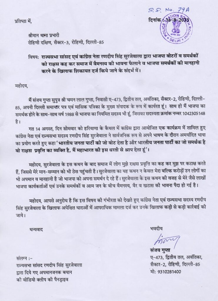 सुरजेवाला के खिलाफ थाना में दी शिकायती में भाजपा कार्यकर्ता संजय ने आरोप लगाया है कि सुरजेवाला ने सार्वजनिक रूप से अपने भाषण के दौरान अमर्यादित भाषा का प्रयोग करते हुए कहा था कि भाजपा को जो वोट देता है, भारतीय जनता पार्टी का जो समर्थक है, वह राक्षस प्रवृत्ति का व्यक्ति है। मैं महाभारत की इस धरती से श्राप देता हूं। शिकायतकर्ता संजय ने कहा कि सुरजेवाला के इस बयान से मेरे और भाजपा के करोड़ों समर्थकों के मान-सम्मान को ठेस पहुंची है। संजय ने सुरजेवाला के खिलाफ कड़ी कार्रवाई की मांग की है।