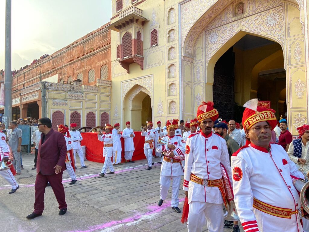 हाथी पर पंचरंगा ध्वज थामे राजपरिवार के सेवक ने तीज माता की सवारी की अगुवाई की। इसके बाद तीज माता को ऊंट, घोड़े और बैलों के साथ एक रथ और पालकी में ढोल बजाते हुए लाया गया। बैंड बाजा, सजे-धजे ऊंट-घोड़े और शाही लवाजमे के साथ चांदी की पालकी पर सवार तीज माता की सवारी त्रिपोलिया गेट, छोटी चौपड़, गणगौरी बाजार होते हुए तालकटोरा पहुंची।