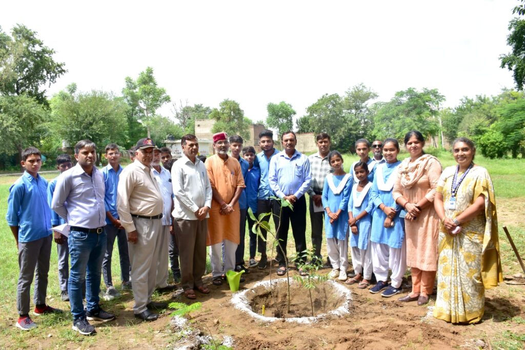 -‘मेरी माटी मेरा देश’ कार्यक्रम के अंदर का स्वतंत्रता सेनानीयों,देश के बलिदानियों, गुमनाम सेनानियों और अमर वीर शहीदों की याद में त्रिवेणी का पौधा रोपण करते हुए डॉ. आर. के.जांगड़ा विश्वकर्मा, जिला शिक्षा अधिकारी नसीब सिंह,कैप्टन लालाराम प्रिंसिपल सरोज यादव विद्यार्थियों के साथ करते हुए,