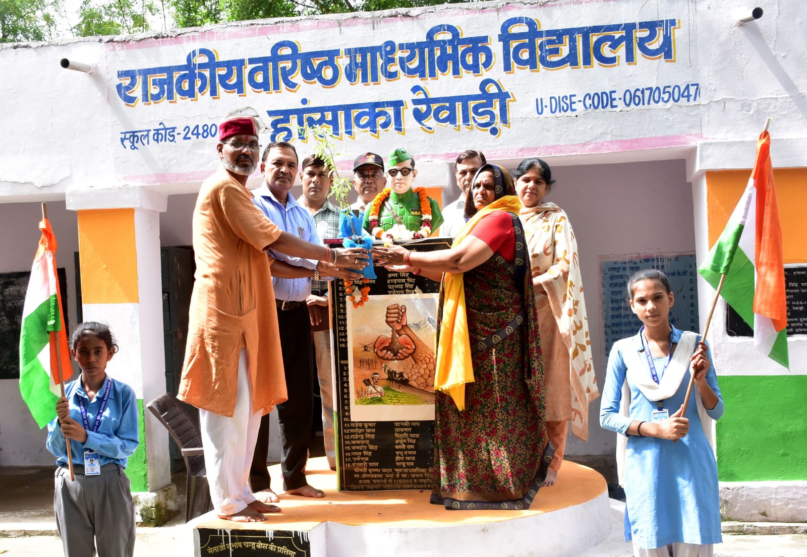 वरुण,जतिन,भूपेश,यश,साहिल,चेतन, नितिन,रवि को पौधा भेंट कर सम्मानित किया गया। कार्यक्रम में प्रिंसिपल डॉ. सरोज यादव द्वारा सभी विद्यार्थियों को देशभक्ति का संदेश देते हुए सभी अतिथियों का आभार व्यक्त किया गया। इस अवसर पर कैप्टन लाला राम,सुमेर सिंह,रामफल,सुरेश ब्लॉक कोऑर्डिनेटर स्वच्छ भारत मिशन, प्रिंसिपल डॉ.सरोज यादव,संजीता,सीमा,उतरा, प्रवीण,किरण,संजू,पूजा,बबली,सुषमा आदि अध्यापक वर्ग सहित सैकड़ो विद्यार्थी उपस्थित थे। फोटो: