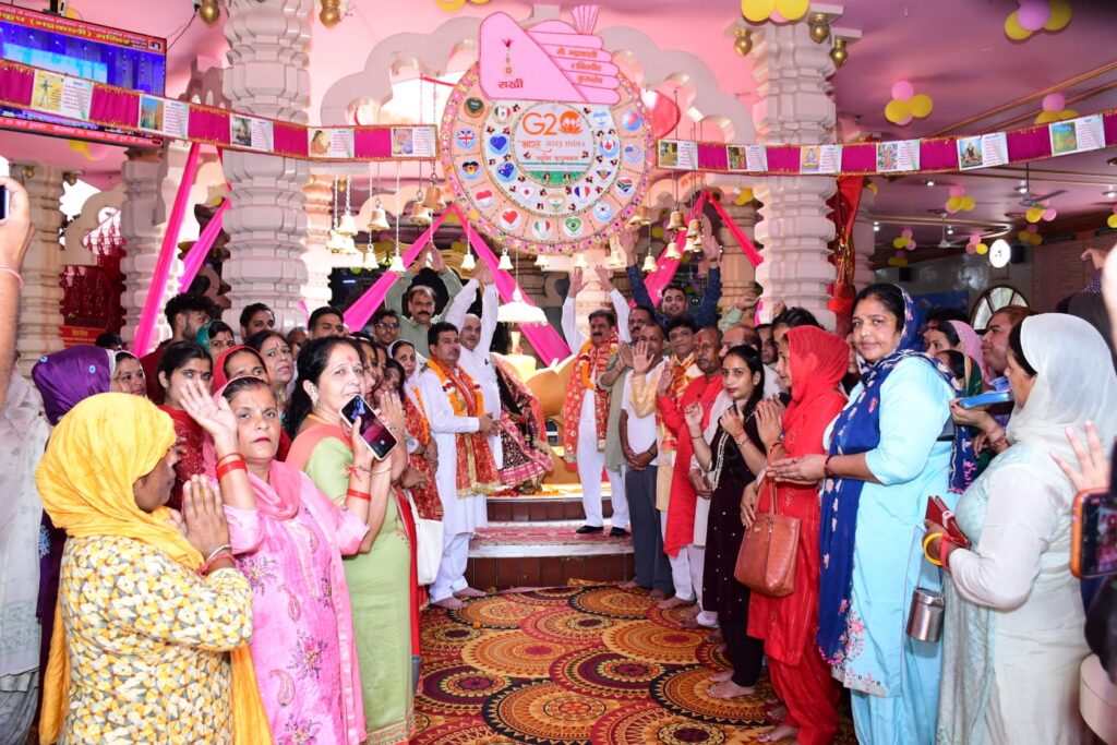 पीठाध्यक्ष के सुपुत्र स्नेहिल शर्मा को भी उनकी बहन मीना जोशी व नीतू शर्मा ने रक्षासूत्र सौंपा, जिसे बाद में बांधा जा सकेगा । इसके बाद मुख्यातिथि द्वारा राखी पर स्वास्तिक बनाया गया । विधायक सुभाष सुधा ने पीठाध्यक्ष पंडित सतपाल शर्मा के आशीर्वाद से व अध्यक्ष नरेंद्र वालिया की अगुवाई में नगर देवी माँ भद्रकाली जी को नगर की सुरक्षा के लिए समस्त सेवक मंडल के सदस्यों की उपस्थिति में 51 फुट की G20 राखी मां भद्रकाली जी को समर्पित की । पीठाध्यक्ष ने यह भी बताया कि 51 फुट की यह राखी विशेष तौर पर भारत देश को G20 अध्यक्षता मिलने की खुशी में रखकर तैयार करवाई गई है । यह राखी भारत की शान G20 प्रेसीडेंसी को समर्पित की गई । इसका उद्देश्य लोगों में G20 के प्रति जागरूकता लाना, हमारे देश का अभिनंदन करना है ।