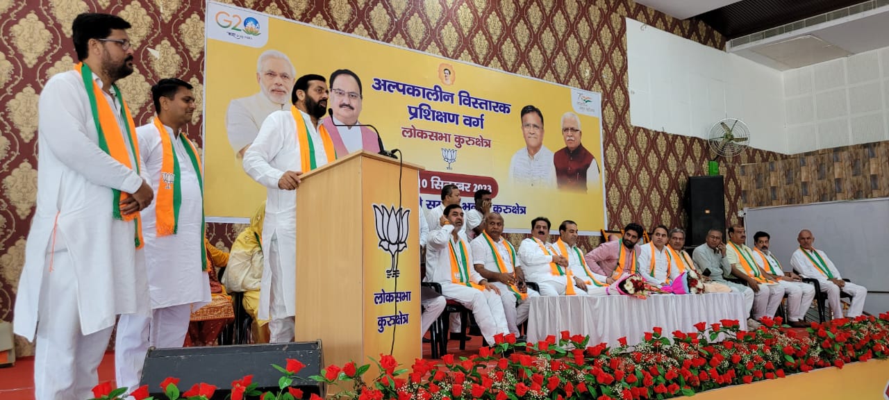 कुरुक्षेत्र। आज सैनी समाज भवन मे लोकसभा कुरुक्षेत्र के भाजपा अल्पकालीन विस्तारक प्रशिक्षण वर्ग कार्यशाला के आरंभ मे सांसद नायब सिंह सैनी, कुरुक्षेत्र जिला प्रभारी जी एल शर्मा, कैथल प्रभारी वेद फूला, प्रदेशध्यक्ष ओबीसी मोर्चा कर्ण देव कम्बोज, जिलाध्यक्ष रवि बतान, कैथल जिलाध्यक्ष अशोक गुर्जर, थानेसर विधायक सुभाष सुधा, जिला विस्तारक कुरुक्षेत्र नरेन्द्र पाल डाबला, कैथल चौपड़ा, जय सिंह पाल, पूर्व सांसद कैलाश सैनी, पूर्व विधायक तेजवीर सिंह, शकुन्तला शर्मा, सुभाष हजवाना, ने भारत माता डा. श्यामा प्रसाद मुखर्जी, पंडित दीनदयाल उपाध्याय के चित्रों पर पुष्पमाला अर्पित कर दीप प्रज्जवलित किया। तदुपरांत जिला प्रभारियों ने मिशन 2024 के लिए अल्पकालीन विस्तारकों को अपने आचरण आचार व्यवहार से दिल जीतते हुए कार्य करने के लिए प्रेरित किया और किस स्थान पर उनकी ड्यूटी लगाई गई उसकी जानकारी दी गई।