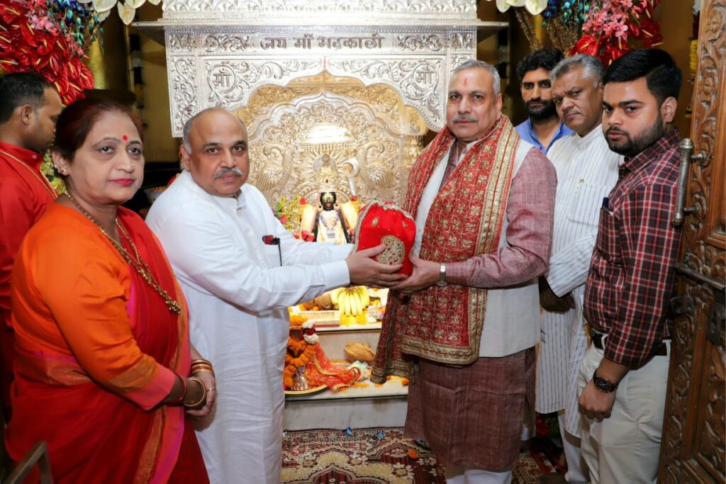 बीजेपी उपाध्यक्ष सौदान सिंह ने परम्परानुसार घोड़ों का जोड़ा श्री देवीकूप पर परिक्रमा कर चढ़ाए और साथ ही माँ भद्रकाली जी को माँ चंद्रघंटा रूप मानकर सफेद फूलों की माला भी अर्पित की । इसके बाद मुख्य दरबार में गर्भगृह में माँ भद्रकाली जी का आहवान कर षोडशोपचार मन्त्रों के साथ माँ का भाव-भक्तिपूर्ण पूजन किया गया । गंगाजल, दूध, दही, शहद, चन्दन, सिंदूर, इत्र से माँ के चांदी चरण को स्नान करवाया गया । । भोग के रूप में मखाने की खीर का भोग लगाया गया। पन्चमेवे व बहुफलों का भोग भी अर्पित किया । सौदान सिंह ने माँ को लाल वस्त्र , श्रृंगार व नारियल भी भेंट किया ।