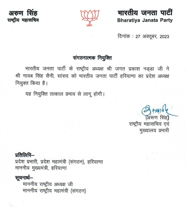 चंडीगढ़। पूर्व मंत्री एवं वर्तमान में कुरुक्षेत्र लोकसभा क्षेत्र के सांसद नायब सैनी को हरियाणा भाजपा का प्रदेशाध्यक्ष बनाया गया है। इस संदर्भ में पार्टी हाई कमान ने नियुक्ति पत्र जारी कर दिया है। नायब सैनी पुराने भाजपाई हैं और उनकी गिनती हरियाणा के मुख्यमंत्री मनोहर लाल के करीबियों में होती है। हालांकि धनखड़ के लिए यह झटका माना जा सकता है। उन्हें संगठन ने राष्ट्रीय सचिव पद पर नियुक्त किया है।