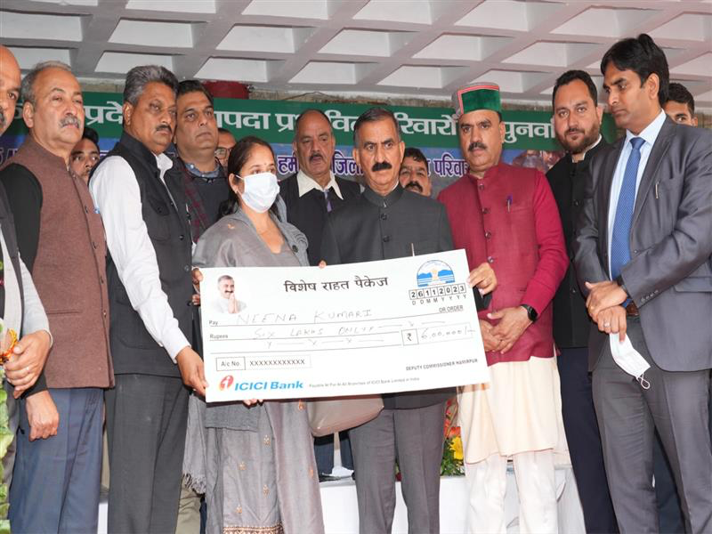 मुख्यमंत्री ने जिला के दो बेघर परिवारों को भूमि के दस्तावेज सौंपे तथा आंशिक रूप से क्षतिग्रस्त हुए 555 मकानों की मरम्मत के लिए 1-1 लाख रुपए की आर्थिक सहायता प्रदान की। उन्हें कुल 5.55 करोड़ की राशि जारी की गई। इसके अलावा उन्होंने प्रभावित 8 दुकानों और ढाबों मालिकों को भी एक-एक लाख रुपए की मुआवजा राशि प्रदान की। उन्होंने क्षतिग्रस्त 622 गौशालाओं की मरम्मत के लिए 3.11 करोड़ रुपए, आपदा में अपना सामान गंवा चुके 71 परिवारों को 50-50 हजार रुपए की आर्थिक सहायता प्रदान की।