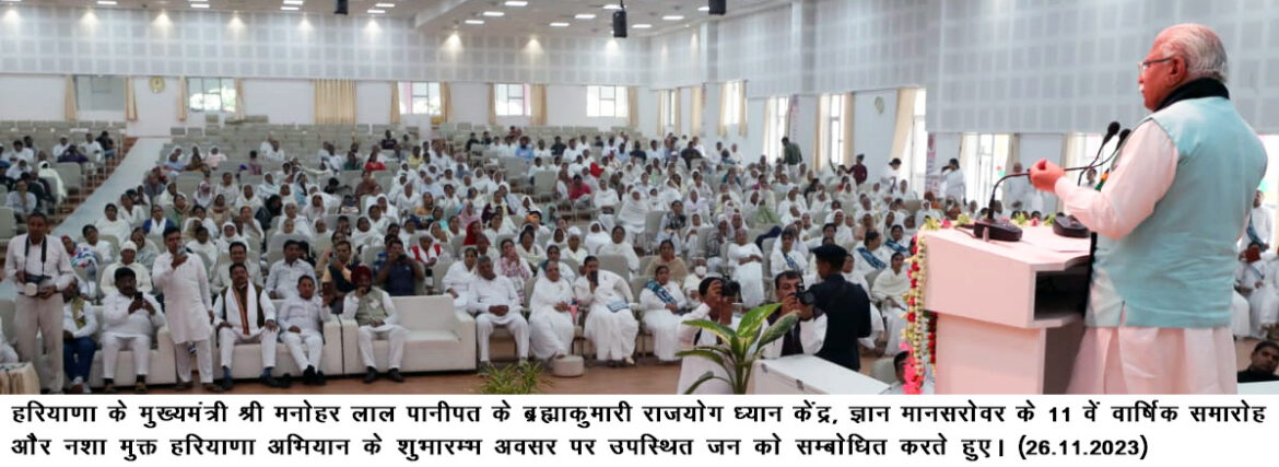 चंडीगढ़ । हरियाणा के मुख्यमंत्री श्री मनोहर लाल ने प्रजापिता ब्रह्माकुमारी ईश्वरीय विश्वविद्यालय पानीपत के ज्ञान मानसरोवर के 11वें वार्षिक समारोह का बतौर मुख्यातिथि शुभारंभ किया। इस दौरान उन्होंने ज्ञान मानसरोवर में लगभग 3 करोड़ रुपये की लागत से बनाए जा रहे मनमोहिनी भवन की आधारशिला रखने के साथ-साथ ज्ञान मानसरोवर में लगभग 3 करोड़ की लागत से स्थापित किए गए दादी चंद्रमणि यूनिवर्सल पीस ऑडिटोरियम को भी लोकार्पित किया। इसके पश्चात मुख्यमंत्री ने नशा मुक्त भारत अभियान के अंतर्गत नशा मुक्त हरियाणा अभियान का शुभारंभ करते हुए नशामुक्त अभियान जागरूकता बस को हरी झंडी दिखाई।