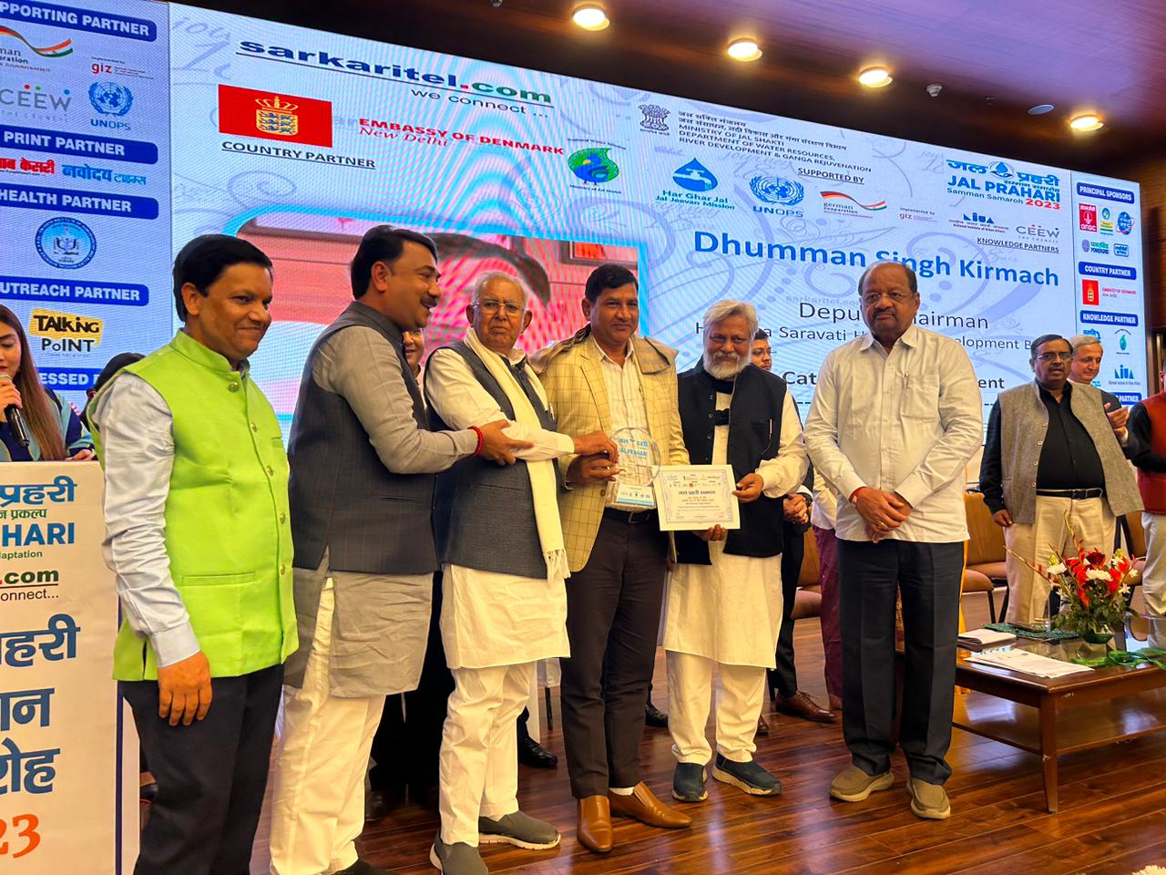 कुरुक्षेत्र । जल है तो कल है, इसी पंक्ति को चरितार्थ करते हुए केंद्र और प्रदेश सरकार द्वारा जल बचाओ अभियान के तहत अनेक योजनाओं को चलाया जा रहा है। इन योजनाओं के तहत ऐसे जल प्रहरियों को सम्मानित भी किया जा रहा है, जिन्होंने जल का संरक्षण करने में अपनी अहम भूमिका निभाई। ऐसे जल प्रहरियों को सम्मानित कर सभी देशवासियों को जल की उपयोगिता और संरक्षण का संदेश देने के साथ साथ उन्हें प्रोत्साहित भी किया जा रहा है ताकि वे अब भी सरकार के जल संरक्षण के अभियान में अपना योगदान दे। अहम पहलू यह है कि जल संरक्षण में अपनी अहम भूमिका अदा करने पर हरियाणा सरस्वती धरोहर विकास बोर्ड के उपाध्यक्ष धुमन सिंह किरमच को राष्ट्रीय जल प्रहरी अवार्ड से सम्मानित किया गया है।
