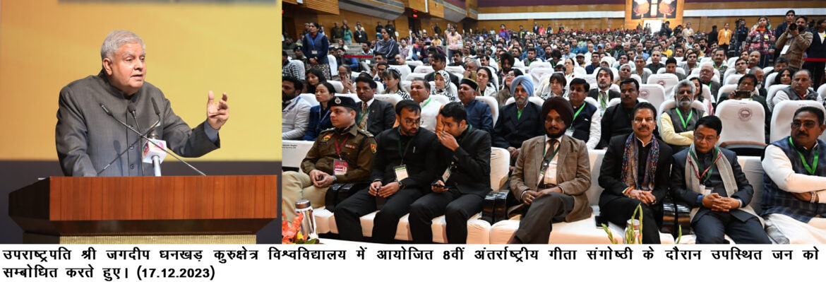 उपराष्ट्रपति आज अंतरराष्ट्रीय गीता महोत्सव के दौरान कुरुक्षेत्र विश्वविद्यालय, कुरुक्षेत्र में आयोजित अंतरराष्ट्रीय गीता संगोष्ठी को संबोधित कर रहे थे। जगदीप धनखड़ ने अपनी पत्नी डॉ सुदेश धनखड़, मुख्यमंत्री मनोहर लाल व अन्य गणमान्य अतिथियों के साथ संगोष्ठी का दीप प्रज्वलित कर शुभारंभ किया। जगदीप धनखड़ ने कहा कि जब-जब मुख्यमंत्री मनोहर लाल मुझे हरियाणा आने का निमंत्रण देते हैं, तो यहां आकर मुझे हर बार नया अनुभव व ऊर्जा मिलती है। इस बार तो कुरुक्षेत्र की धरा पर आने का सौभाग्य मिला है। उन्होंने कहा कि जब वर्ष 2014 में प्रधानमंत्री नरेंद्र मोदी कुरुक्षेत्र में गीता जयंती कार्यक्रम में आये थे, तो उन्होंने मुख्यमंत्री को गीता के संदेश को देश-विदेश में पहुंचाने का विज़न दिया था और मनोहर लाल वर्ष 2016 से लगातार अंतरराष्ट्रीय स्तर पर गीता महोत्सव मना रहे हैं। इस बार के अंतरराष्ट्रीय गीता महोत्सव में पार्टनर स्टेट असम है, जिससे उत्तरी-पूर्वी राज्यों में गीता का संदेश पहुंचेगा।