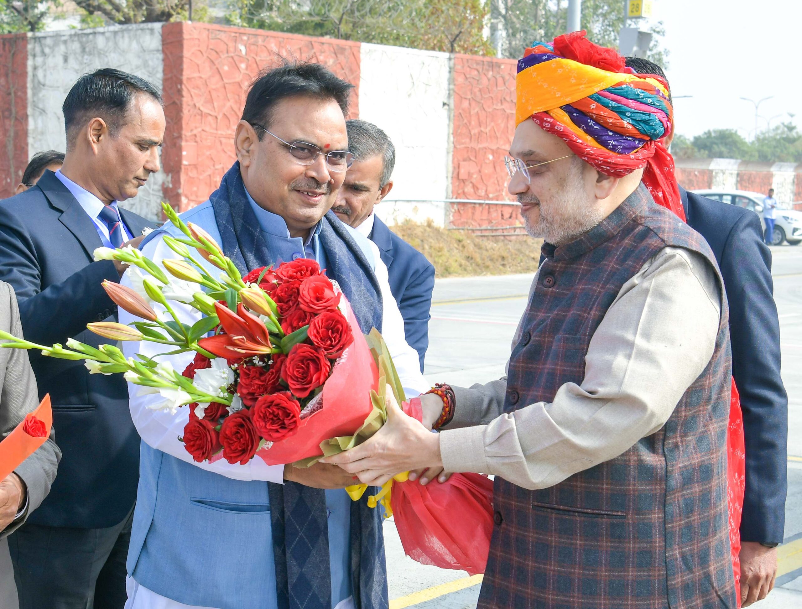 जयपुर। मुख्यमंत्री भजनलाल शर्मा ने केन्द्रीय गृहमंत्री अमित शाह का आज शुक्रवार को जयपुर पहुंचने पर उनका स्वागत किया। शाह जयपुर में प्रधानमंत्री नरेंद्र मोदी की उपस्थिति में आयोजित होने वाली तीन दिवसीय पुलिस महानिदेशक व महानिरीक्षक कांफ्रैंस में भाग लेंगे।इस दौरान विधानसभा अध्यक्ष वासुदेव देवनानी, उप मुख्यमंत्री दिया कुमारी, डॉ. प्रेमचन्द बैरवा, मंत्री गजेन्द्र सिंह खींवसर, डॉ. किरोड़ी लाल मीणा, राज्यवर्द्धन सिंह राठौड़, मदन दिलावर, अविनाश गहलोत, बाबूलाल खराड़ी, जोगाराम पटेल,सुरेश रावत, जोराराम कुमावत, कन्हैयालाल,सुमित गोदारा, सांसद सीपी जोशी, रामचरण बोहरा, महापौर श्रीमती सौम्या गुर्जर, मुख्य सचिव सुधांश पंत, पुलिस महानिदेशक यू.आर.साहू, अतिरिक्त मुख्य सचिव गृह आनंद कुमार, जयपुर पुलिस कमिश्नर बीजू जार्ज जोसफ, जयपुर कलक्टर श्रीप्रकाश राजपुरोहित, सहित अन्य जनप्रतिनिधि एवं अधिकारी उपस्थित थे।