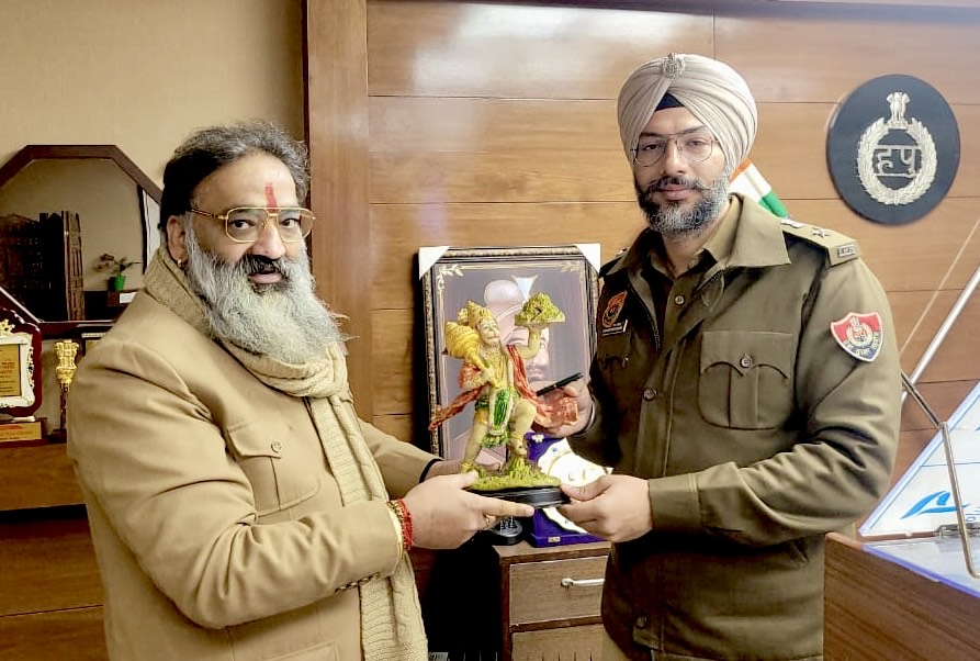 एसपी अंबाला जश्नदीप सिंह रंधावा को वीरेश शांडिल्य ने विश्व हिन्दू तख्त की तरफ से नए साल की बधाई दी व संकटमोचक हुनमान की प्रतिमा भेंट की